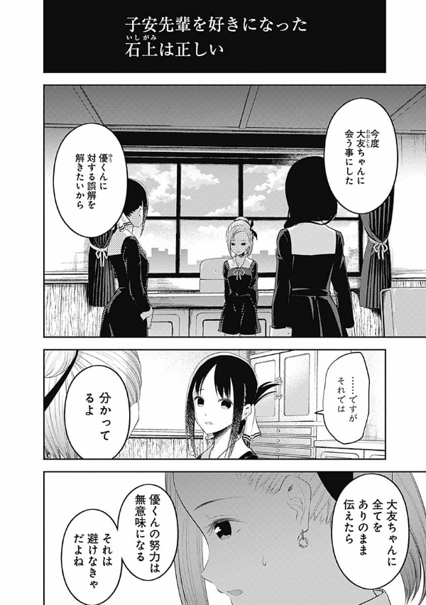 「恋愛は告白した方が負けなのである!」 エリートの集う秀知院学園生徒会で出会った会長・白銀御行と副会長・四宮かぐや…。この両想いであるはずの天才2人が、互いに相手に惚れさせ、相手から告白させようと日常の全てで権謀術数の限りを尽くす、新感覚のラブコメ!! …だったはずの2人も付き合い始め、時はバレンタインが控える2年生の3学期!! 石上優も、想いを寄せる先輩子安つばめからチョコを貰えるか、期待と不安が交錯する日々を過ごしていた。一方、己の想いに少しずつ気が付き始めている伊井野ミコはどう振る舞って良いのか悩んでおり…。それぞれの思惑を胸にバレンタイン当日を迎える!! そして、石上&藤原の誕生日なども過ごしつつ、卒業式も間近に迫る──。