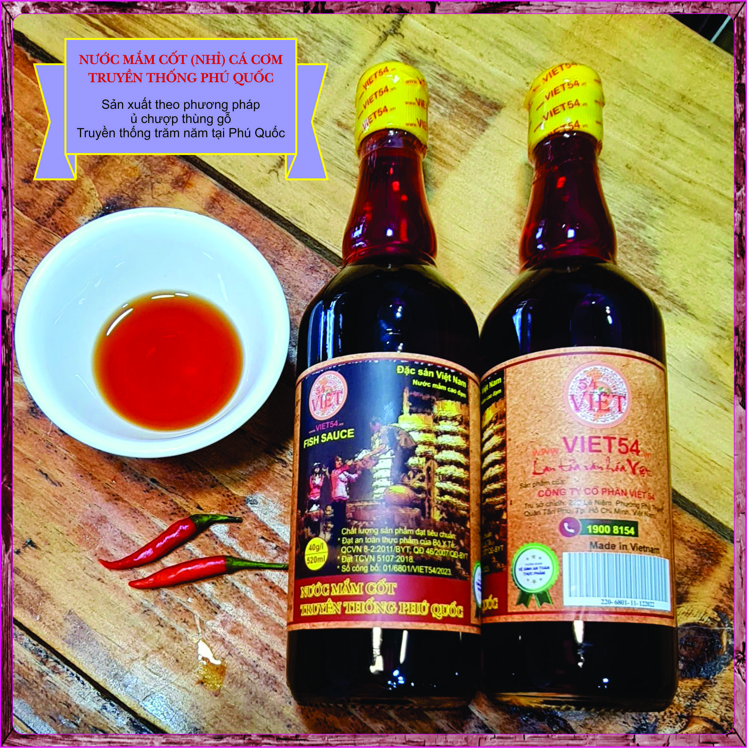 Sản phẩm chính hãng của Công ty VIỆT 54 - VIET 54. Nước mắm cốt 30 độ đạm, sản xuất theo phương pháp ủ chượp thùng gỗ truyền thống Phú Quốc – Đặc sản Việt