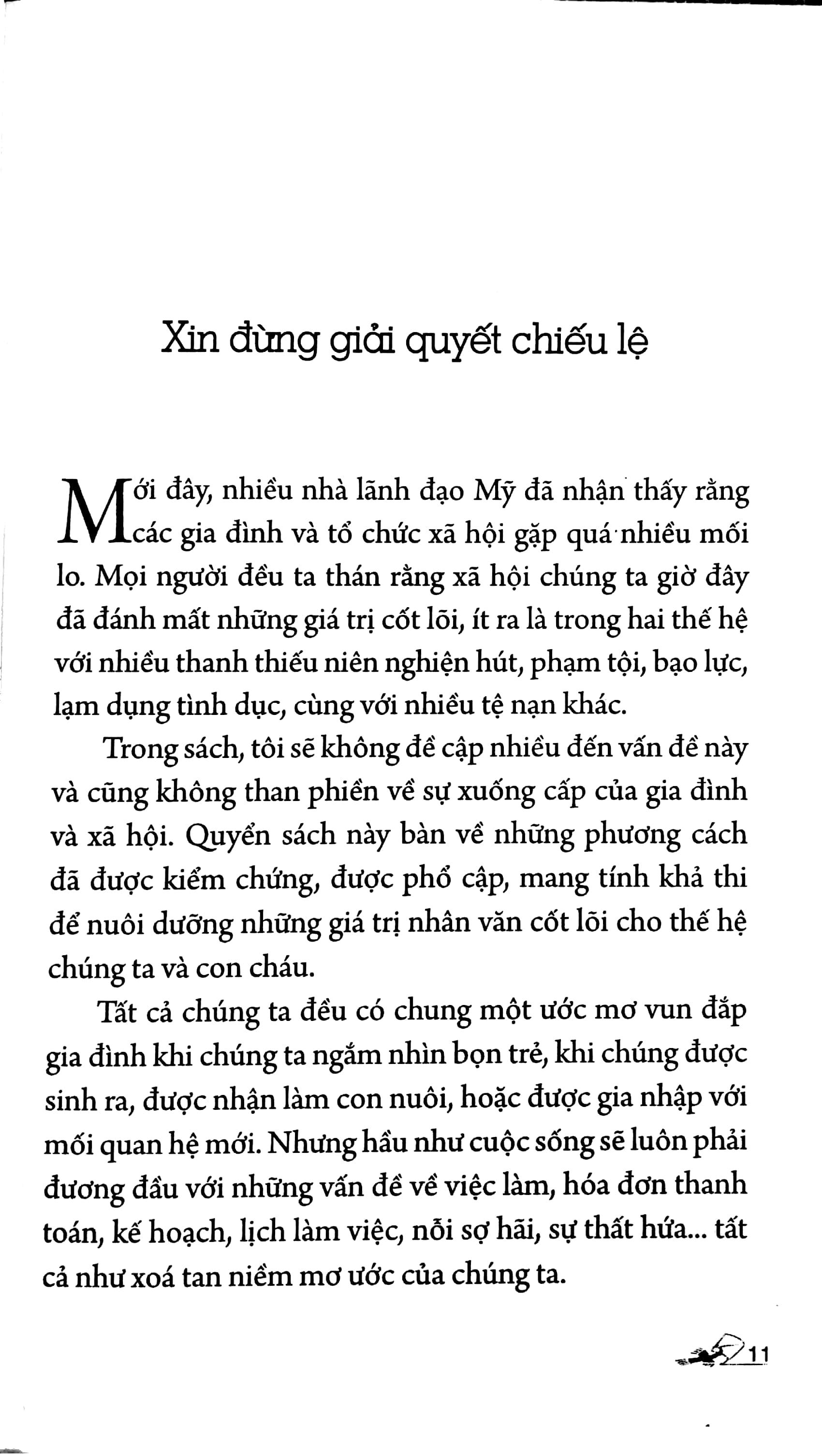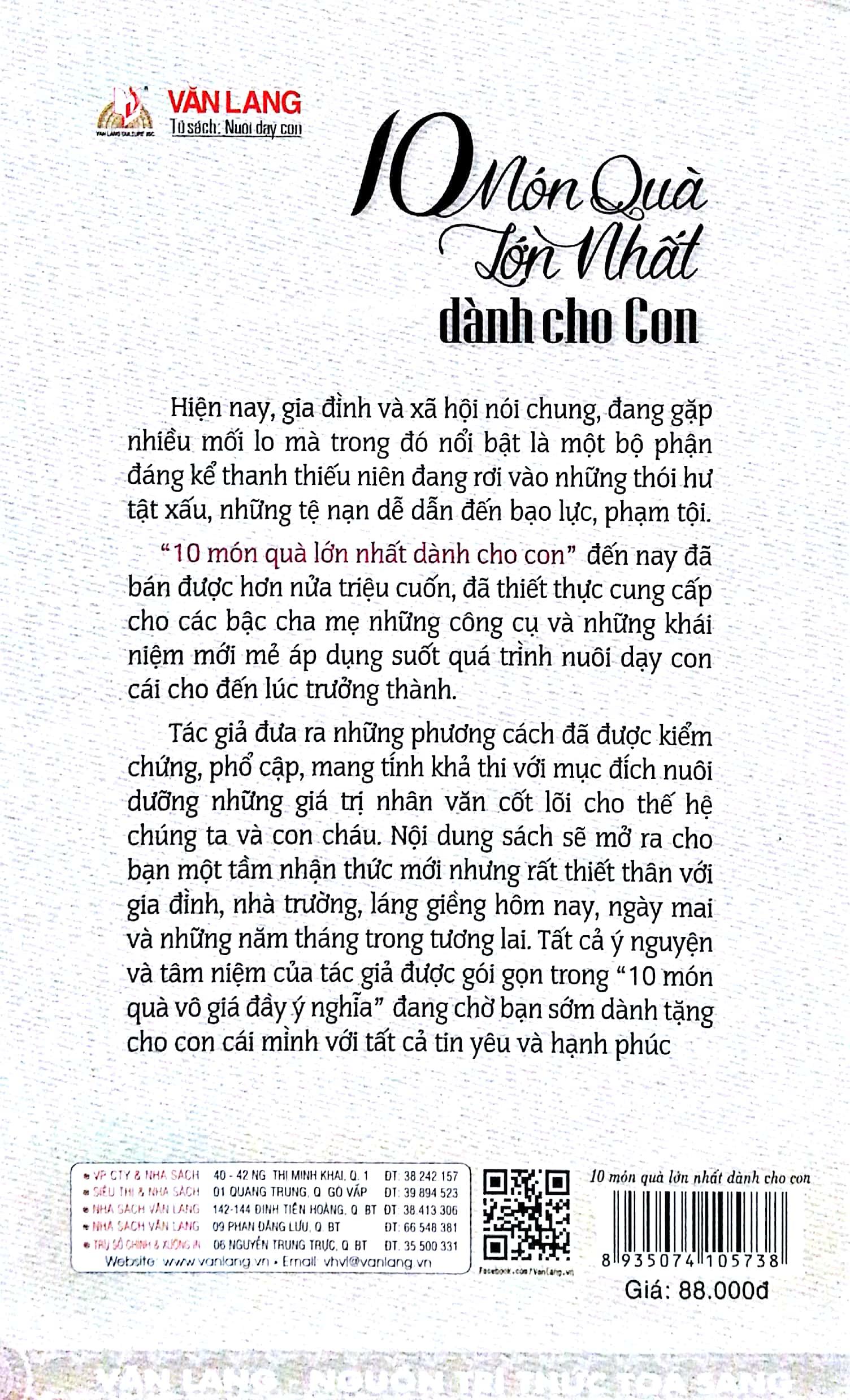 Tác giả đưa ra những phương cách đã được kiểm chứng, phổ cập, mang tính khả thi với mục đích nuôi dưỡng những giá trị nhân văn cốt lõi cho thế hệ chúng ta và con cháu. Nội dung sách sẽ mở ra cho bạn một tầm nhận thức mới nhưng rất thiết thân với gia đình, nhà trường, láng giềng hôm nay, ngày mai và những năm tháng trong tương lai. Tất cả ý nguyện và tâm niệm của tác giả được gói gọn trong sách 10 món quà vô giá đầy ý nghĩa đang chờ bạn sớm dành tặng cho con cái mình với tất cả tin yêu và hạnh phúc.