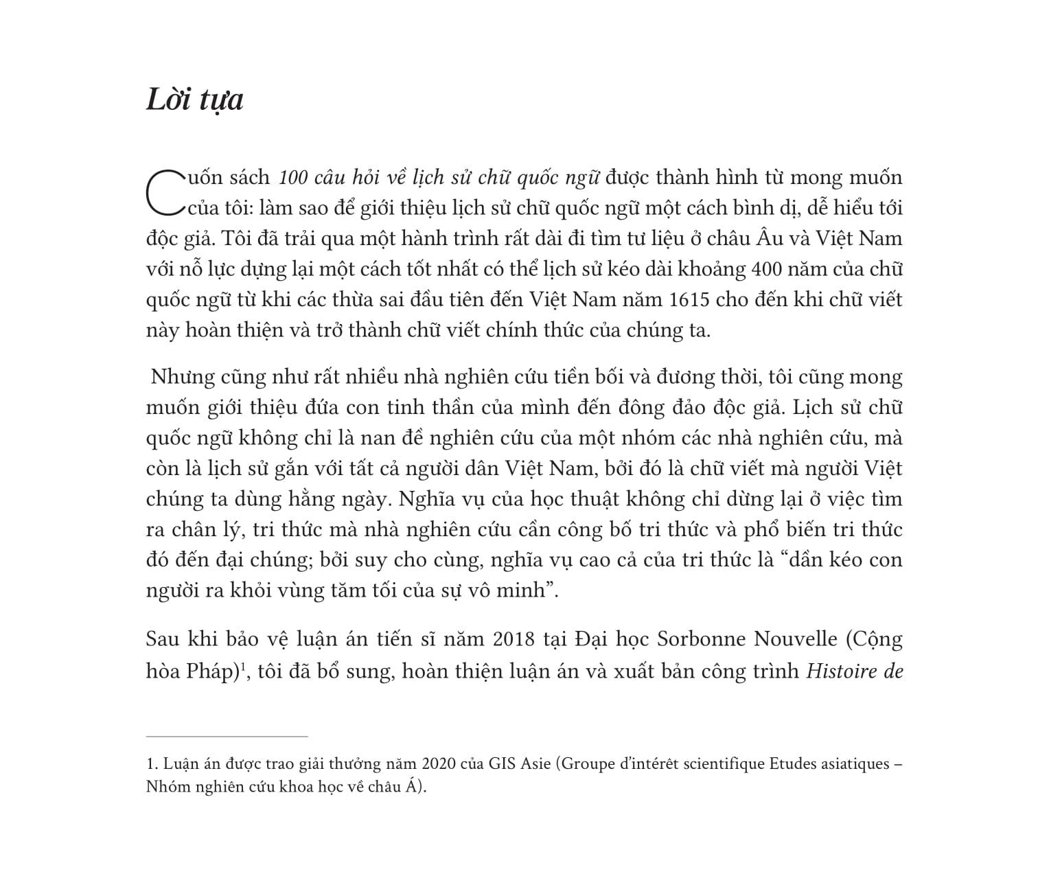 Tác giả cố gắng đặt m.ình vào vị trí của độc giả và của người Việt Nam nói chung, để tự vấn m.ình những vấn đề xoay quanh lịch sử chữ viết mà chúng ta dùng hằng ngày: hoàn cảnh ra đời, quá trình hình thành, phát triển, cũng như những nhân vật có nhiều đóng góp quan trọng chữ quốc ngữ.