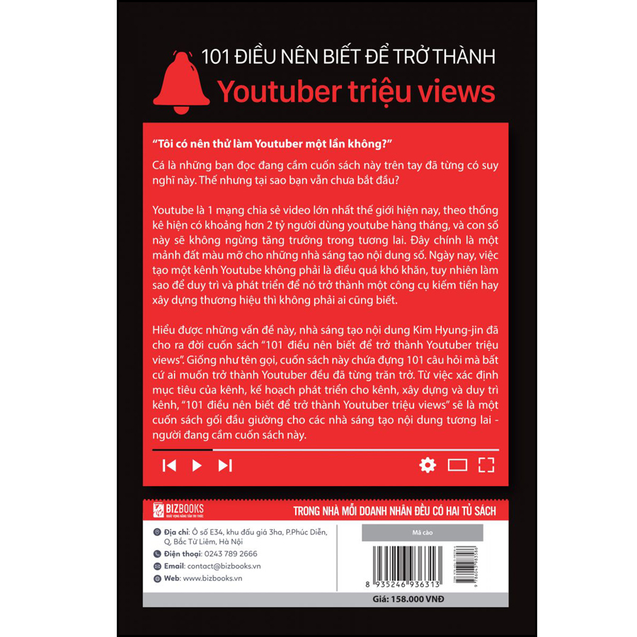 - Bizbooks nghĩ 101 điều nên biết để trở thành Youtuber triệu views là một cuốn sách cần thiết cho tất cả những ai muốn làm YouTuber và những người đang là YouTuber. Đối với những ai chưa bắt đầu mở kênh thì việc nắm bắt phương hướng cũng sẽ hữu ích cho họ, còn với những ai đang điều hành kênh mà số lượt xem và số người đăng ký không tăng thì cuốn sách chứa đựng những bước đột phá có thể giải quyết được vấn đề đó. Cuối cùng, những người quản lý kênh tốt cũng có thể tham khảo cuốn sách này để phát triển kênh YouTube của mình hơn nữa và vẽ ra phương hướng trong tương lai.