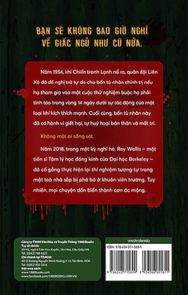 BẠN SẼ KHÔNG BAO GIỜ NGHĨ VỀ GIẤC NGỦ NHƯ CŨ NỮA. Năm 1954, khi Chiến tranh Lạnh nổ ra, quân đội Liên Xô đã trao quyền tự do cho bốn tù nhân chính trị khi họ tham gia vào một cuộc thử nghiệm yêu cầu họ phải tỉnh táo trong vòng 14 ngày dưới sự tác động của một loại khí kích thích mạnh. Cuối cùng, bốn tù nhân này có hành vi giết hại, tự huỷ hoại bản thân và mất trí. Không một ai sống sót. Năm 2018, trong một kỳ nghỉ hè, Roy Wallis – một tiến sĩ Tâm lý học đáng kính của Đại học Berkeley – cố gắng thực hiện lại thí nghiệm tương tự trong một toà nhà sắp bị phá bỏ ở khuôn viên trường. Anh và hai trợ lý sinh viên của mình chia sẻ các ca làm việc luôn phiên kéo dài tám giờ để quan sát các đối tượng thử nghiệm trẻ tuổi người Úc suốt ngày đêm. Tuy nhiên, mọi chuyện dần biến thành cơn ác mộng không ai có thể tưởng tượng được. Thông tin tác giả