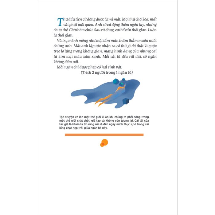 2 Người Trong 1 Ngăn Tủ Một tập truyện ngắn vẽ lên một thế giới kì ảo trong tương lai khi mà hành tinh chúng ta phải trả món “nợ sinh thái” sau khi đã vắt kiệt mọi nguồn năng lượng của trái đất. Tác phẩm đưa người đọc chạm tới đáy của những lo âu, rồi lại vỡ ra những nghi ngờ lo sợ. Nó làm ta vỡ lẽ khi phải sống trong một thế giới hiện đại, chật chội, giả tạo và không còn tương lai. Cái tài của tác giả là đã khiến ta tin rằng rồi sẽ đến ngày ta thực sự phải sống trong cái lồng chật hẹp trôi giữa ngân hà này. Và dù có ở trong thế giới nào con người cũng phải đối diện với lựa chọn một bên là thờ ơ, đơn điệu nhưng an toàn, tiện lợi và một bên là thử thách thú vị nhưng rủi ro. Khi đời sống con người chẳng khác mấy so với robot thì cũng là lúc phần người nhất của chính mình trỗi dậy.