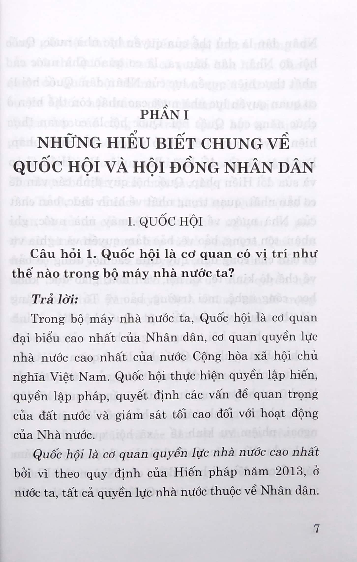 Phần I. Những hiểu biết chung về Quốc hội và Hội đồng nhân dân, gồm những câu hỏi và trả lời về vị trí, chức năng, nhiệm vụ, quyền hạn, tổ chức… của Quốc hội và Hội đồng nhân dân các cấp; vị trí, vai trò của đại biểu Quốc hội và đại biểu Hội đồng nhân dân, qua đó thấy được mục đích, ý nghĩa và tầm quan trọng của việc bầu cử đại biểu Quốc hội và đại biểu Hội đồng nhân dân các cấp.