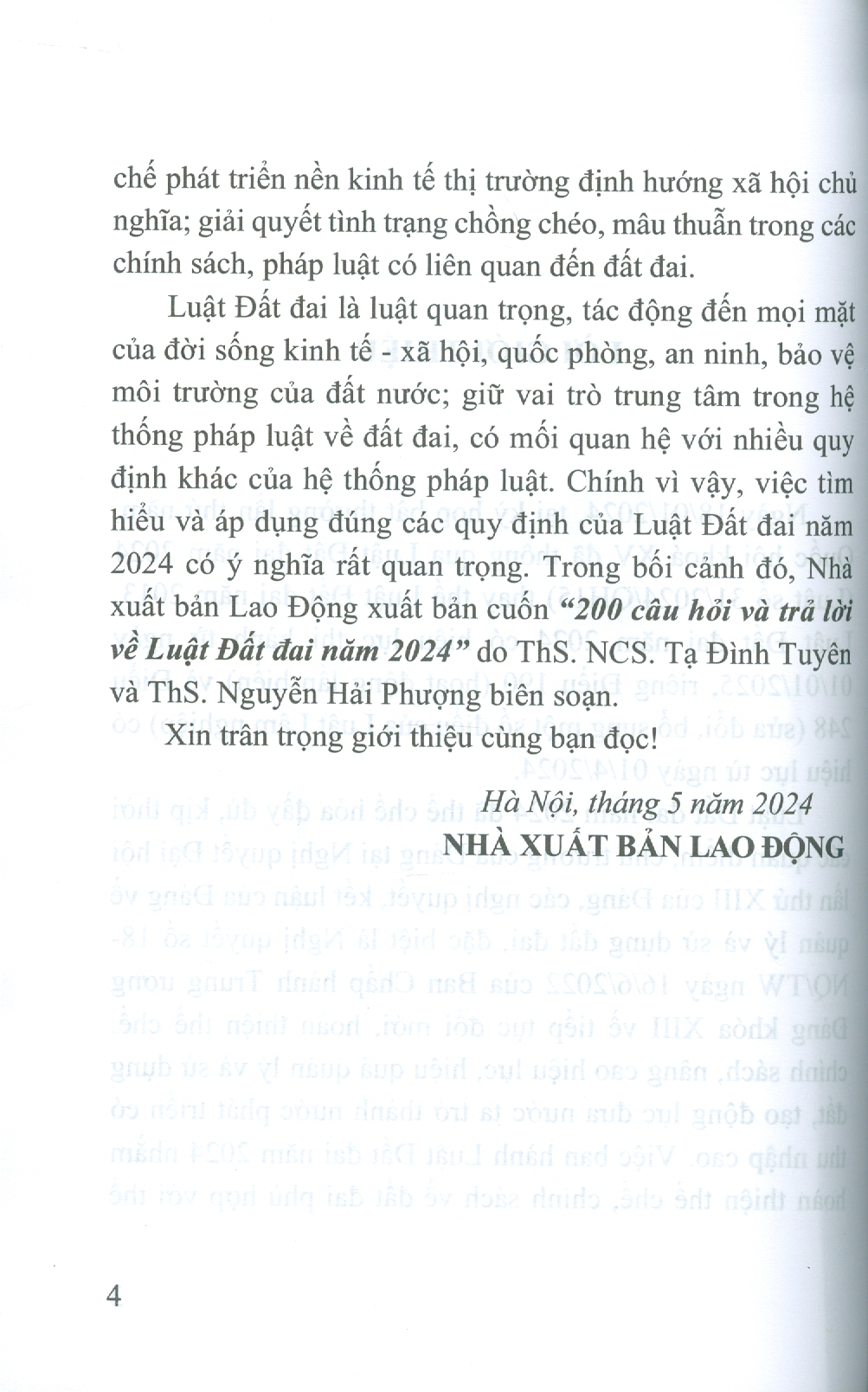 ✨200 Câu Hỏi Và Trả Lời Về Luật Đất Đai Năm 2024 (Sách chuyên khảo) - ThS. NCS. Tạ Đình Tuyên, ThS. Nguyễn Hải Phượng