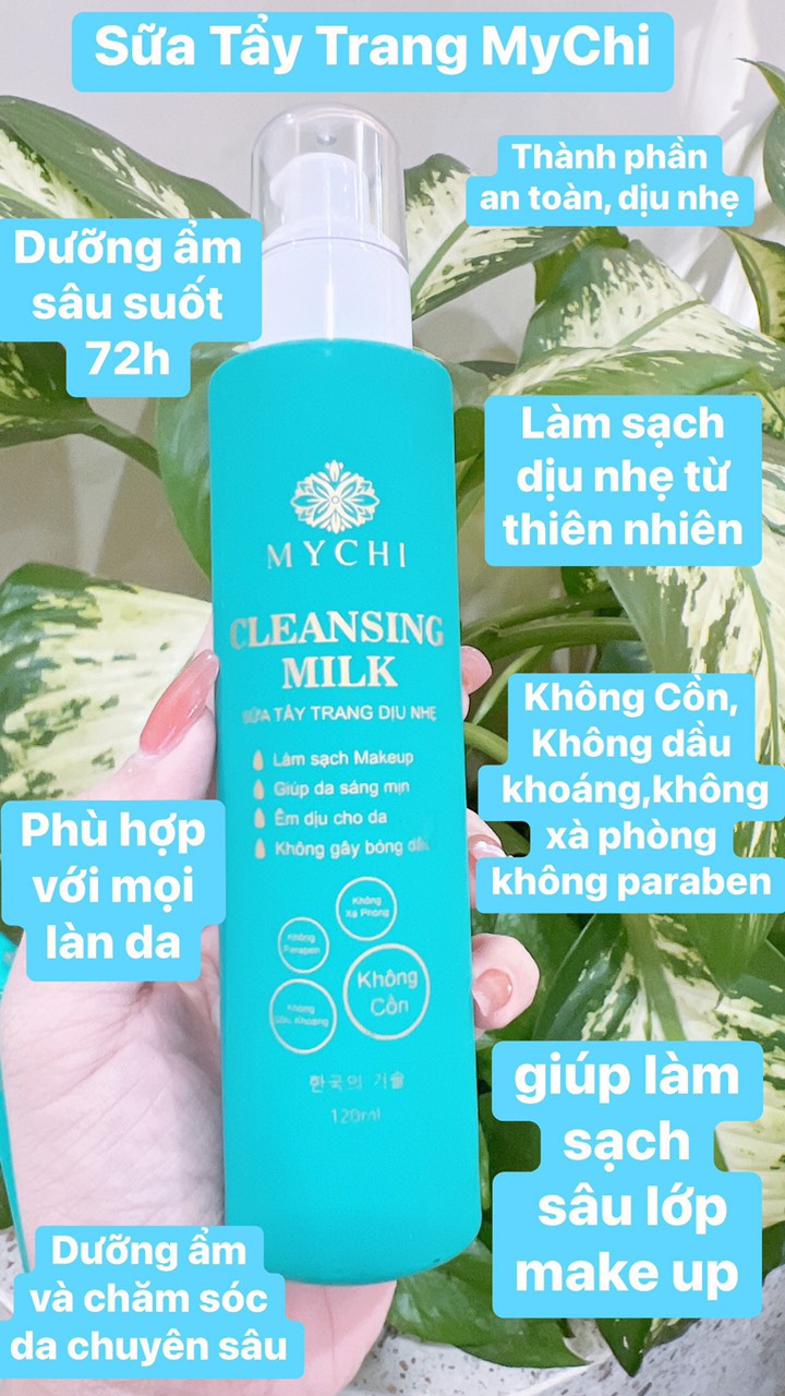 - Sữa tẩy trang Mychi Cleansing Milk không chỉ giúp làm sach lớp trang điểm cứng đầu mà còn giúp lấy đi lượng dầu nhờn, bụi bẩn trên da, làm sạch sâu lỗ chân lông mà không làm khô da, giúp duy trì hàng rào bảo vệ tự nhiên của da, kết hợp dưỡng ẩm và chăm sóc da chuyên sâu.