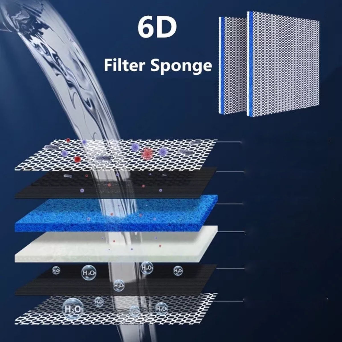 - Lớp mút trong bông lọc bể cá 6D tăng khả năng chứa các chất cặn thô bị giữ lại, giúp cho tấm lọc lâu bị đầy hơn nhiều lần so với các loại bông lọc trên thị trường. Nhất là bạn không có điều kiện về thời gian để vệ sinh bông lọc thường xuyên, thì đây là một sự lựa chọn tuyệt vời.