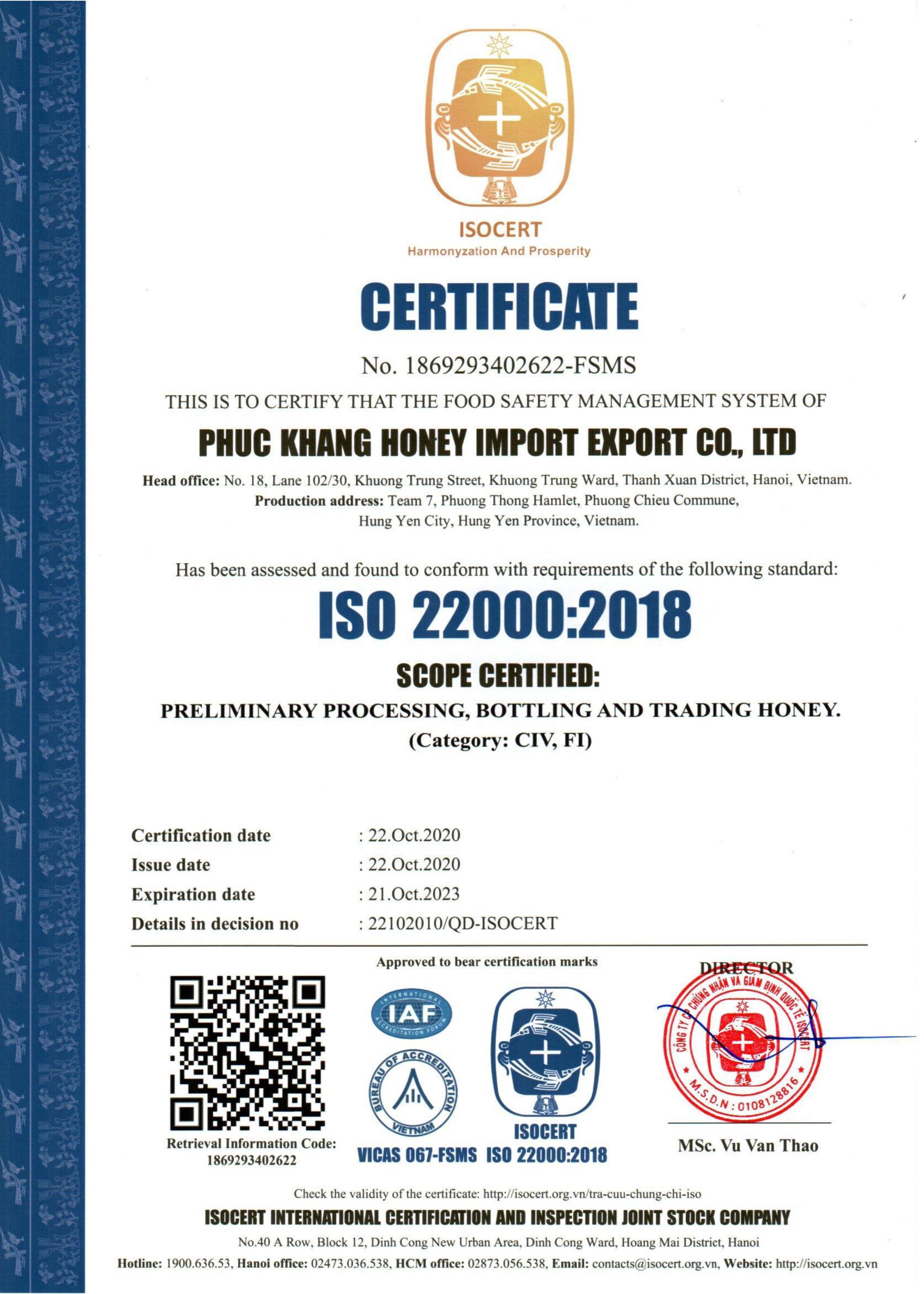 Giấy Chứng Nhận Đạt Tiêu Chuẩn ISO 22000: 2018