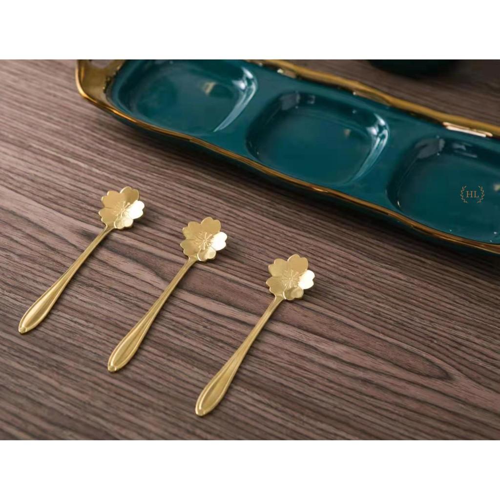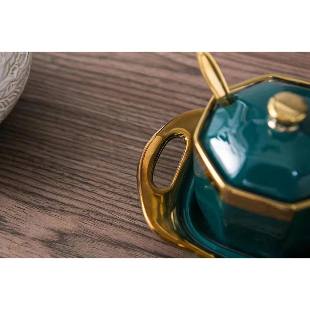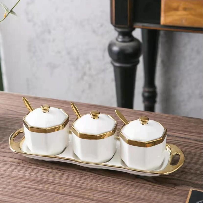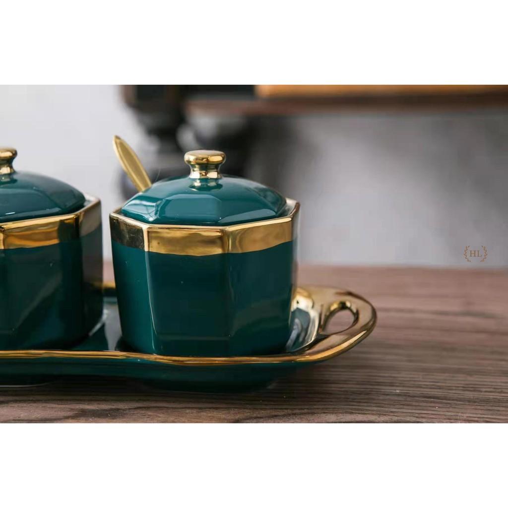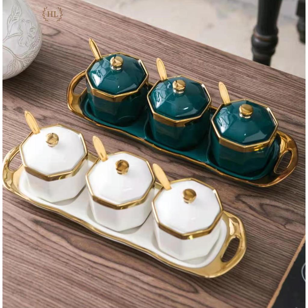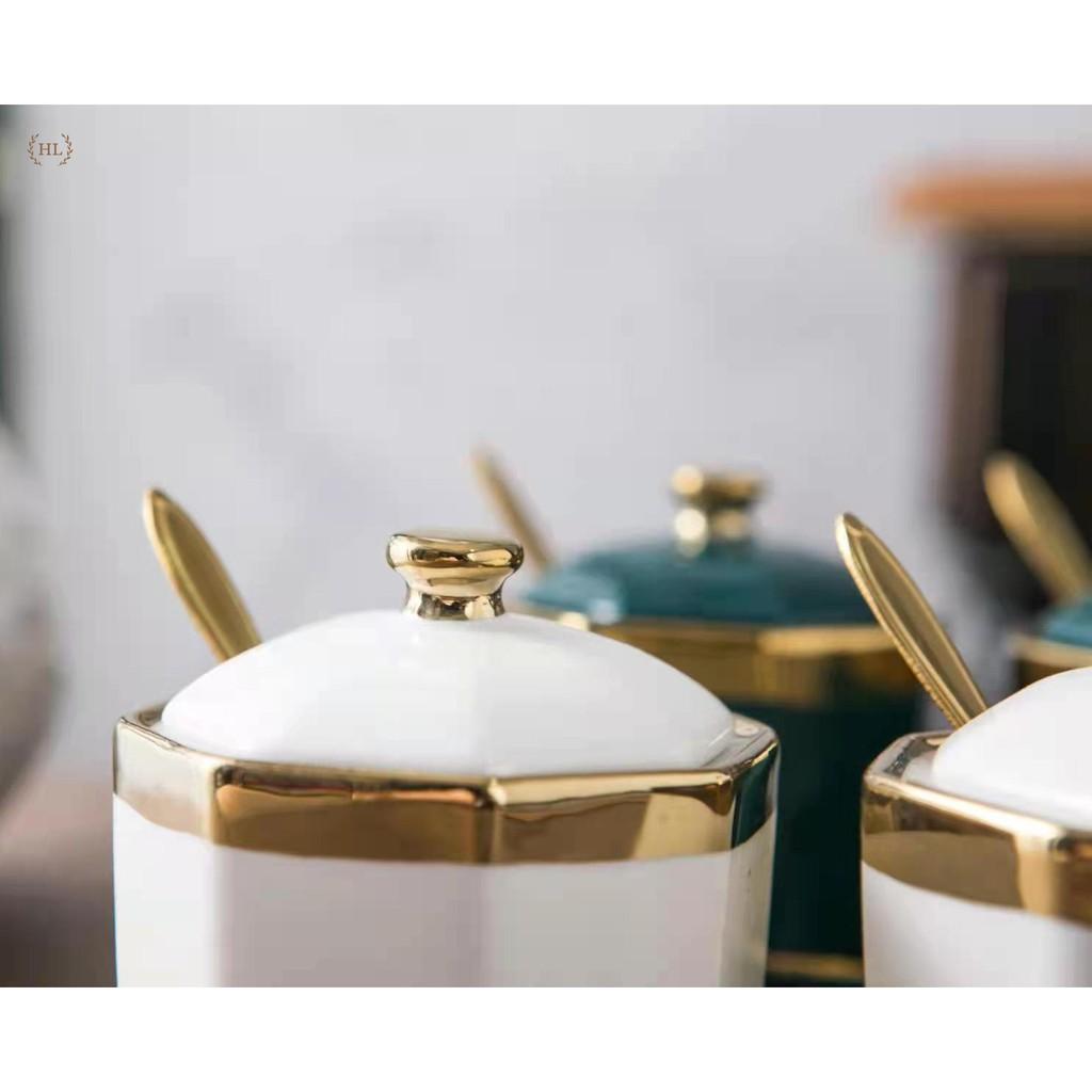 ✨3 Hũ đựng gia vị chất liệu sứ kẻ viền vàng kèm thìa Inox có khay hứng dáng lục giác 2022 | GIA VỊ SỨ LỤC NĂNG XANH TRẮNG