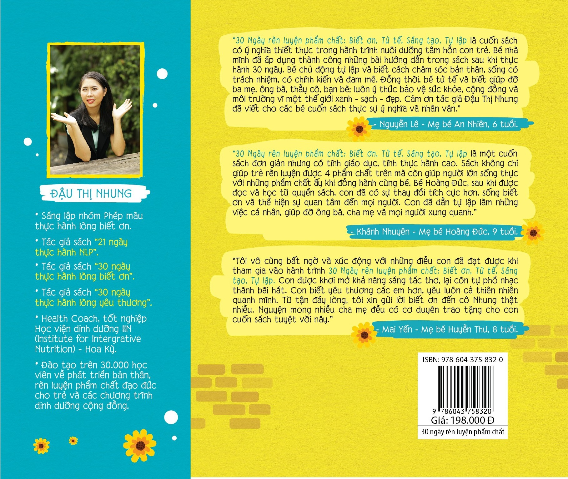 Mua tại TiktokI.GIỚI THIỆU SÁCH Nhà xuất bản Phụ nữ Việt Nam vừa ấn hành sách 30 Ngày rèn luyện phẩm chất: Biết ơn, Tử tế, Sáng tạo, Tự lập của tác giả Đậu Thị Nhung. Sách do 2 họa sĩ Hoa Quỳnh, Phúc Bee minh họa. Dòng sách nuôi dạy con hiện nay trên thị trường rất nhiều, trong đó, tác giả Đậu Thị Nhung xác lập một chỗ đứng cho riêng mình với loạt sách bổ trợ kỹ năng trong 30 ngày. Cuốn mới nhất của chị là 30 Ngày rèn luyện phẩm chất: Biết ơn, Tử tế, Sáng tạo, Tự lập tiếp tục phát huy thế mạnh của cuốn trước là nét vẽ rất sinh động, màu sắc sặc sỡ nhưng nội dung khu biệt hơn khi tập trung giúp trẻ luyện rèn để bồi dưỡng bốn phẩm chất quý báu là tử tế, biết ơn, tự lập và sáng tạo. Nội dung sách chia thành 4 phần tương ứng 4 tuần, trải dài 30 ngày như: