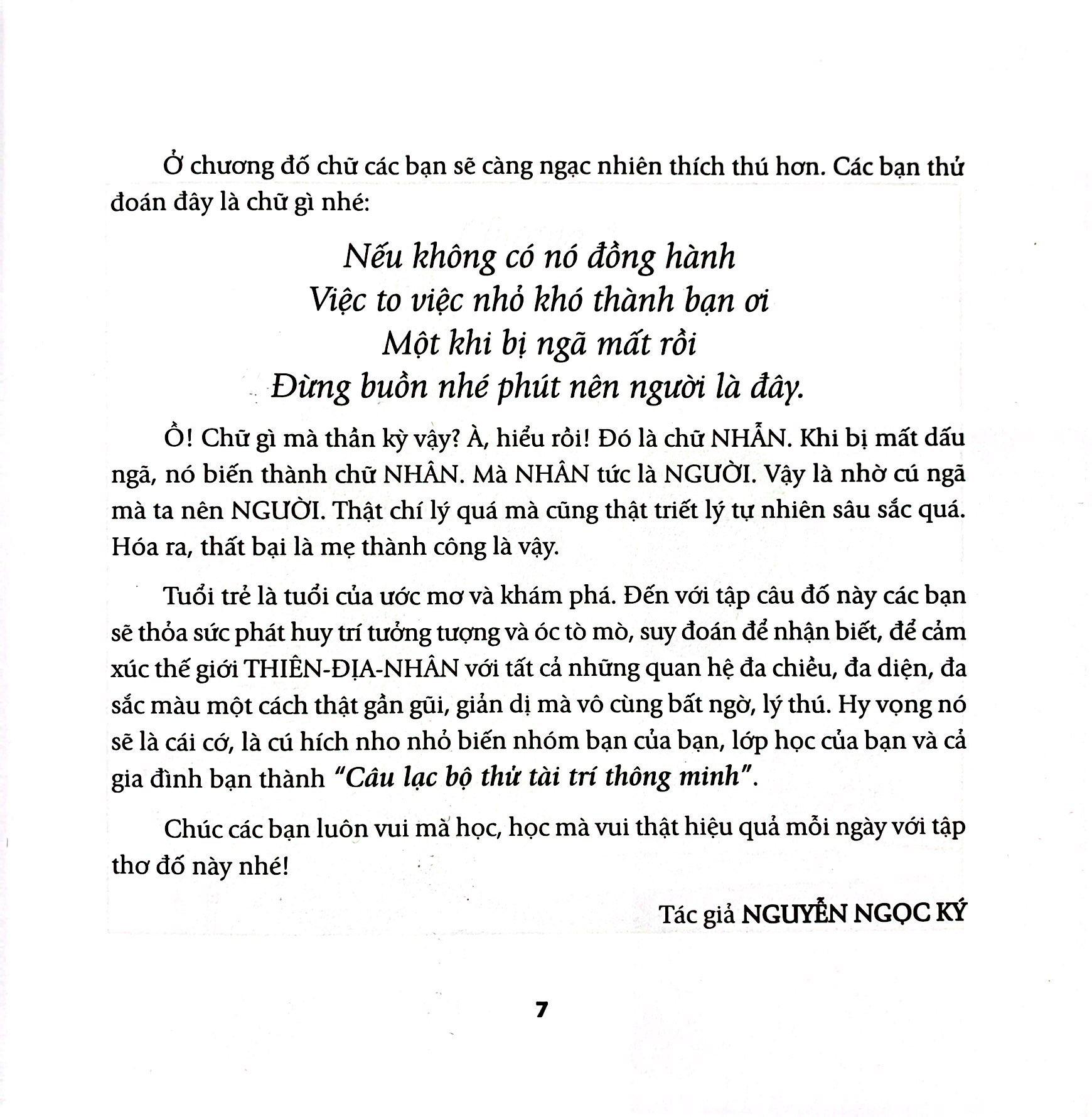 Tuyển chọn câu đố đặc sắc dành cho học sinh. Mặc dù không còn trực tiếp đứng lớp nhưng nhiều năm qua Nhà giáo Ưu tú Nguyễn Ngọc Ký vẫn bền bĩ chăm lo đời sống tinh thần, góp phần định hình và vun đắp nhân cách cho các bạn trẻ. Ngoài những buổi giao lưu với học sinh sinh viên trên khắp cả nước, Nhà giáo Nguyễn Ngọc Ký còn miệt mài bên những trang viết, mang đến cho bạn đọc nhiều cuốn sách ý nghĩa như Tôi đi học, Tôi học đại học… Đặc biệt, với tâm huyết của mình, Nhà giáo Nguyễn Ngọc Ký đã sáng tác ra hàng trăm câu đố vừa dí dóm nhưng không kém phần trí tuệ. Tiếp nối tâm huyết này, Công ty Văn hóa Sáng tạo Trí Việt - First News cùng Nhà giáo Nguyễn Ngọc Ký gửi tới bạn đọc cuốn sách 420 câu đố vui thông minh (First News và NXB Trẻ ấn hành). 420 câu đố vui thông minh, được chọn lọc từ 16 tập câu đố đã được Nhà giáo Nguyễn Ngọc Ký sáng tác và phát hành trong mấy chục năm qua. Cuốn sách gồm 18 chương, đề cập đến những chủ đề hết sức phong phú và đa dạng: về các loài hoa, các con vật, các loài cá, các tỉnh thành trong nước hay về các danh nhân trong lịch sử… Mỗi chủ đề giống như một bài thơ dài, trong đó phản ánh một cách sinh động bản chất của đối tượng mà câu đố đang đề cập đến. Đối tượng đó không ở đâu xa, mà ở ngay trong cuộc sống của các bạn nhỏ: là lá, hoa, cây cối, chim muông, là bánh trái, các vật dụng… Bên cạnh thế giới thiên nhiên phong phú sống động, các bạn nhỏ sẽ được dịp tìm hiểu, khám phá, rung động trước thế giới lịch sử, địa lý đầy quyến rũ, thú vị. Nhà giáo Nguyễn Ngọc Ký gửi gắm: “Tuổi trẻ là tuổi của ước mơ và khám phá. Đến với tập câu đố này các bạn sẽ thỏa sức phát huy trí tưởng tượng và óc tò mò, suy đoán để nhận biết, để cảm xúc thế giới THIÊN-ĐỊA-NHÂN với tất cả những quan hệ đa chiều, đa diện, đa sắc màu một cách thật gần gũi, giản dị mà vô cùng bất ngờ, lý thú”. Đa số các câu đố trong 420 câu đố vui thông minh đều sử dụng thể thơ lục bát, chỉn chu về vần điệu giúp các em dễ đọc và dễ thuộc. Nhà giáo Nguyễn Ngọc Ký hy vọng đây sẽ là cái cớ, là cú hích nho nhỏ để các em học sinh, các lớp học hay mỗi gia đình nhỏ trên khắp cả nước hình thành nên “Câu lạc bộ thử tài trí thông minh”, cùng tham gia vui đố để vừa có thể chơi vừa tìm hiểu kiến thức phong phú trong cuộc sống. Sách được phát hành tại nhà sách Trí Việt - 11H Nguyễn Thị Minh Khai, Quận 1, TP. HCM và các nhà sách khác trên toàn quốc. THÔNG TIN VỀ NHÀ GIÁO ƯU TÚ NGUYỄN NGỌC KÝ: Nhà giáo Nguyễn Ngọc Ký sinh ngày 28-06-1947 tại Hải Thanh, Hải Hậu, Nam Định. Ông bị liệt đôi tay từ năm 4 tuổi; 7 tuổi đi học dùng chân viết. Hai lần ông được Bác Hồ thưởng huy hiệu vì thành tích vượt khó học giỏi. Năm 1970, ông tốt nghiệp Đại học Tổng hợp, khoa Ngữ Văn, sau đó đi dạy và trở thành Nhà giáo Ưu tú năm 1992, Nhà văn Việt Nam đầu tiên viết bằng chân. Hiện ông đã nghỉ hưu, tuần 3 lần phải chạy thận nhân tạo. Song với nghị lực và sự cố gắng phi thường, ông vẫn miệt mài ngày ngày vừa đi giao lưu với học sinh các trường vừa tiếp khách tư vấn tâm lý, giáo dục qua Tổng đài 1088 và tiếp tục sáng tác tại TP. Hồ Chí Minh. Ông được cố Thủ tướng Phạm Văn Đồng ngợi khen là tấm gương vượt khó tuyệt vời và trở thành huyền thoại sống cho bao thế hệ cắp sách tới trường suốt nửa thế kỷ qua. Tuổi trẻ học đường cả nước 50 năm qua đã biết và coi ông là thần tượng khi được học bài EM KÝ ĐI HỌC (sách Tập đọc lớp 3 từ 1964-1983,) ANH KÝ ĐI HỌC (sách Kể chuyện lớp 4 từ 1983-2000), BÀN CHÂN KỲ DIỆU (sách Tiếng Việt lớp 4 từ 2000 đến nay). Đến nay, gia tài sáng tác của Nhà giáo Nguyễn Ngọc Ký đã đạt con số 30 đầu sách. Nhiều cuốn đã trở thành sách gối đầu giường của tuổi thơ như Tôi đi học, tuyển tập Câu đó vui tâm đắc. Ông có 3 bài thơ (Nặn đồ chơi, Con đường làng, Em thương) in trong sách giáo khoa tiểu học được nhiều thế hệ học trò thuộc lòng từ tấm bé. Ông 3 lần được tặng giải thưởng trong các cuộc thi sáng tác cho tuổi thơ toàn quốc. Được báo Tuổi Trẻ tặng giải Nhất trong cuộc thi viết về mẹ. Các tác phẩm của ông luôn thấm đẫm tư tưởng nhân văn và giáo dục sâu sắc. Song cách thể hiện lại rất giản dị, hồn nhiên, dí dỏm, tinh tế, giàu hình ảnh, nhạc điệu và cảm xúc nên được bạn đọc gần xa háo hức đón đọc, được tái bản nhiều lần với số lượng hàng chục ngàn bản.