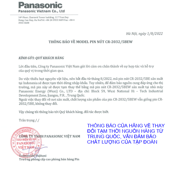 - Pin nút Panasonic được sản xuất bởi nhà máy của Panasonic tại Indonesia. Trong đầu năm 2023, sản phẩm sẽ có xuất xứ Trung Quốc do hãng có thay đổi nguồn hàng trong ngắn hạn.