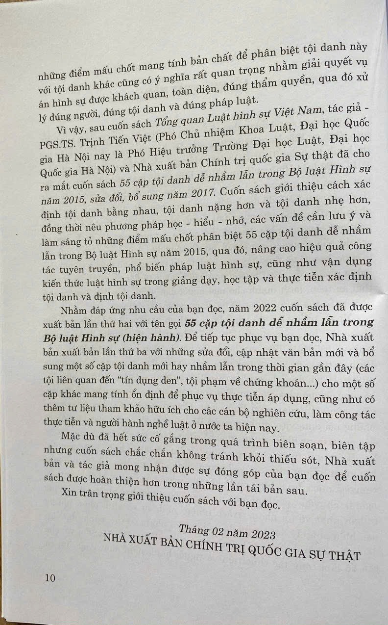 55 Cặp Tội Danh Dễ Nhầm Lẫn Trong Bộ Luật Hình Sự (Hiện Hành) (Xuất bản lần thứ ba có sửa chữa, bổ sung)   Tác giả: PGS. TS. Trịnh Tiến Việt Nhà xuất bản: