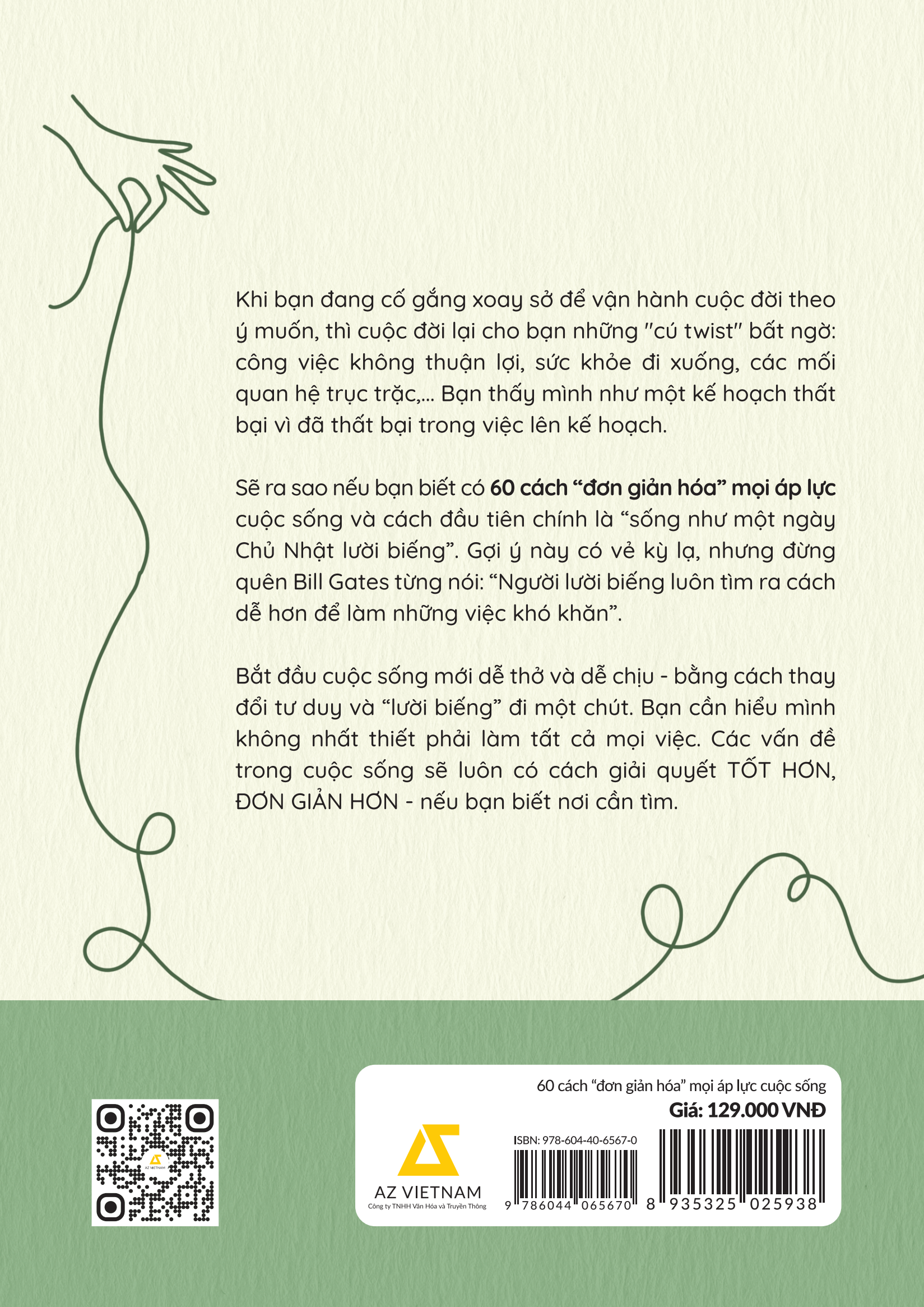 Bắt đầu cuộc sống mới dễ thở và dễ chịu - bằng cách thay đổi tư duy và “lười biếng” đi một chút. Theo chân hành trình thử-nghiệm những cách đơn giản hóa áp lực của Huấn luyện viên và Khách hàng (hai nhân vật có thật) xuyên suốt cuốn sách này, bạn sẽ hiểu mình không nhất thiết phải làm tất cả mọi việc.