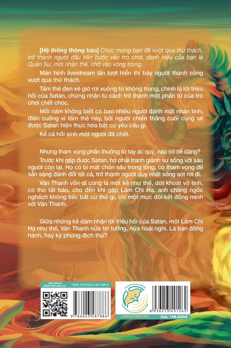 VĂN ÁN: [Hệ thống thông báo] Chúc mừng bạn đã vượt qua thử thách, trở thành người đầu tiên bước vào trò chơi, danh hiệu của bạn là Quân Sư, mời nhận thẻ, chờ vào vòng trong. Màn hình livestream lần lượt hiển thị bảy người thành công vượt qua thử thách. Tấm thẻ đen xé gió rơi xuống từ không trung, chính là lời triệu hồi của Satan, chứng nhận tư cách trở thành phần tử của trò chơi chết chóc. Mỗi năm không biết có bao nhiêu người đánh mất nhân tính, điên cuồng vì tấm thẻ này, bởi người chiến thắng cuối cùng sẽ được Satan hiện thực hóa bất cứ yêu cầu gì. Kể cả hồi sinh một người đã chết. Nhưng trước khi gặp được Satan, họ phải tranh giành sự sống với sáu người còn lại. Tham vọng phần thưởng từ tay ác quỷ, nào có dễ dàng?