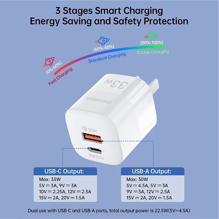 ✨Adapter Củ Sạc 33W PPS/ PD 30W / QC 3.0 1 Cổng Type C 1 Cổng USB Nhỏ Gọn CHOETECH PD5006 Sạc Nhanh iPhone, iPad, Samsung - Hàng Chính Hãng