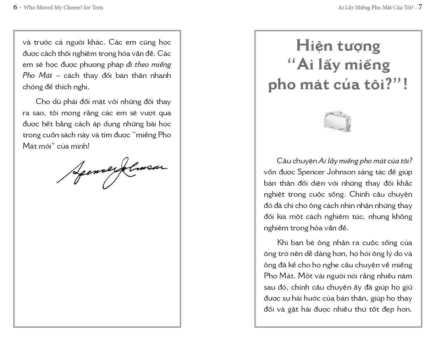 Hàng triệu bản in của cuốn sách “Ai lấy miếng pho mát của tôi?” đã đến tay độc giả trên toàn thế giới. Điều này không ngăn được TS. Spencer Johnson tiếp tục đưa câu chuyện và những bài học về sự thay đổi của mình vào cuốn sách “Ai lấy miếng pho mát của tôi” – phiên bản dành cho các bạn trẻ tuổi teen.