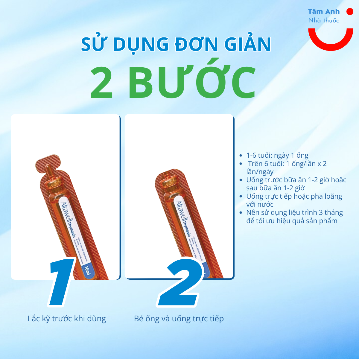 - Trẻ không cần dùng nhiều sản phẩm bổ trợ, tiết kiệm chi phí cho mẹ chỉ với 1 ống uống Altawell thymosin 3 tác động: Hỗ trợ ăn ngon, tăng đề kháng, tăng chiều cao và cân nặng.