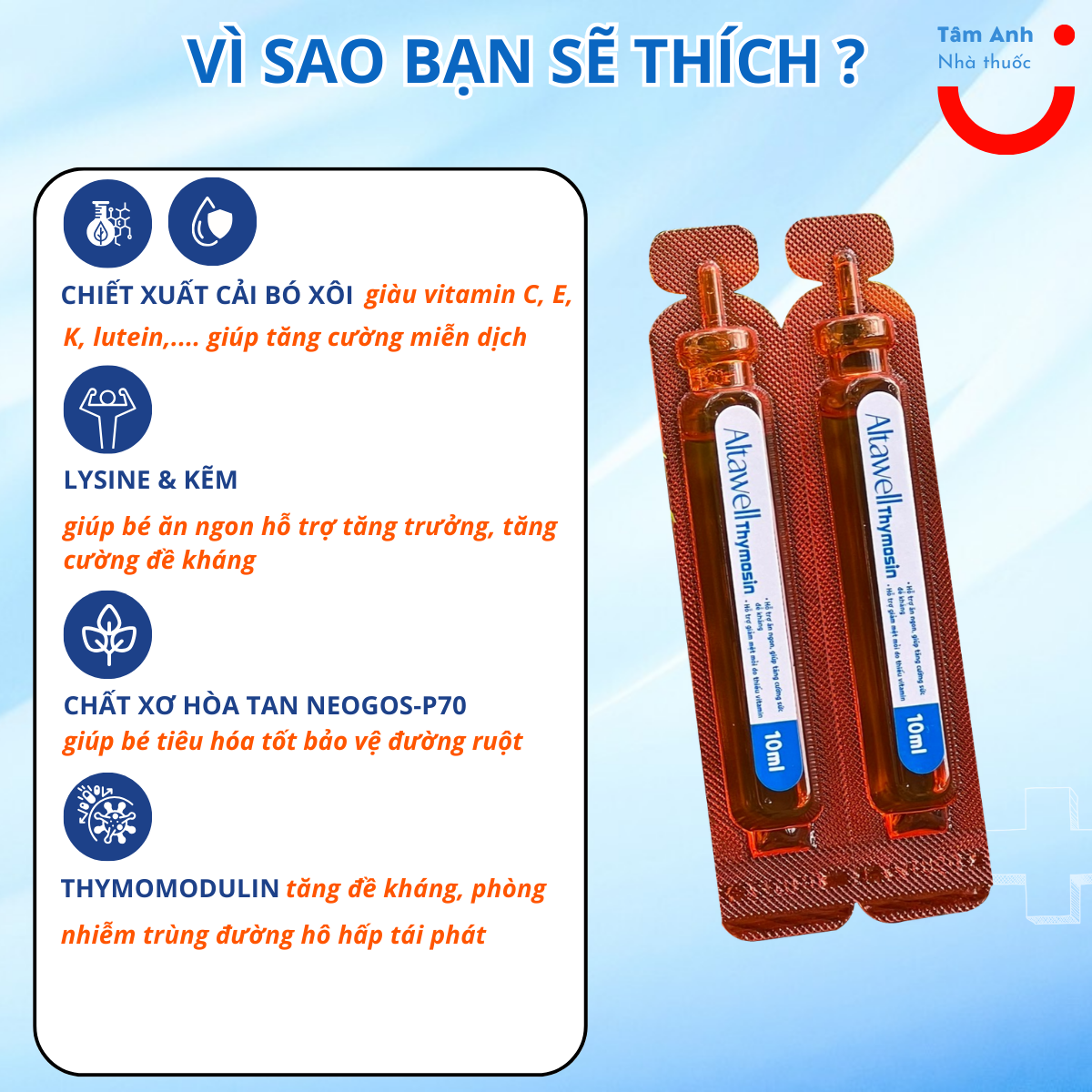 - Vì sao bạn sẽ thích Altawell Thymosin - Trẻ không cần dùng nhiều sản phẩm bổ trợ, tiết kiệm chi phí cho mẹ chỉ với 1 ống uống Altawell thymosin 3 tác động: Hỗ