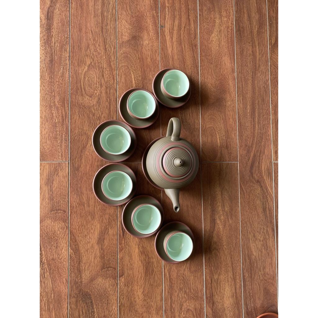 Ấm chén men xanh rêu đậm khắc hoạ tiết sen Gốm sứ Bát Tràng Bọc đồng cao cấp ĐẸP sang trọng và cuốn hút 1 ấm 6 chén 7 đĩa kê giá 1000k Phụ kiện