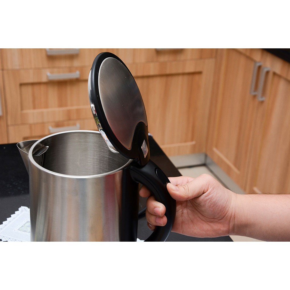 Dung tích: 1.7L  Công suất: 1800W  Ưu điểm nổi bật:  2 lớp cách nhiệt: Thép không gỉ bên trong, nhựa mát tay bên ngoài – an toàn tuyệt đối, nhất là với gia đình có