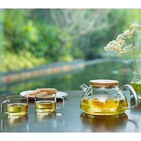 Bộ ly ấm pha trà thủy tinh chịu nhiệt quai gỗ có thể nấu trên bếp hồng ngoại, bếp gas