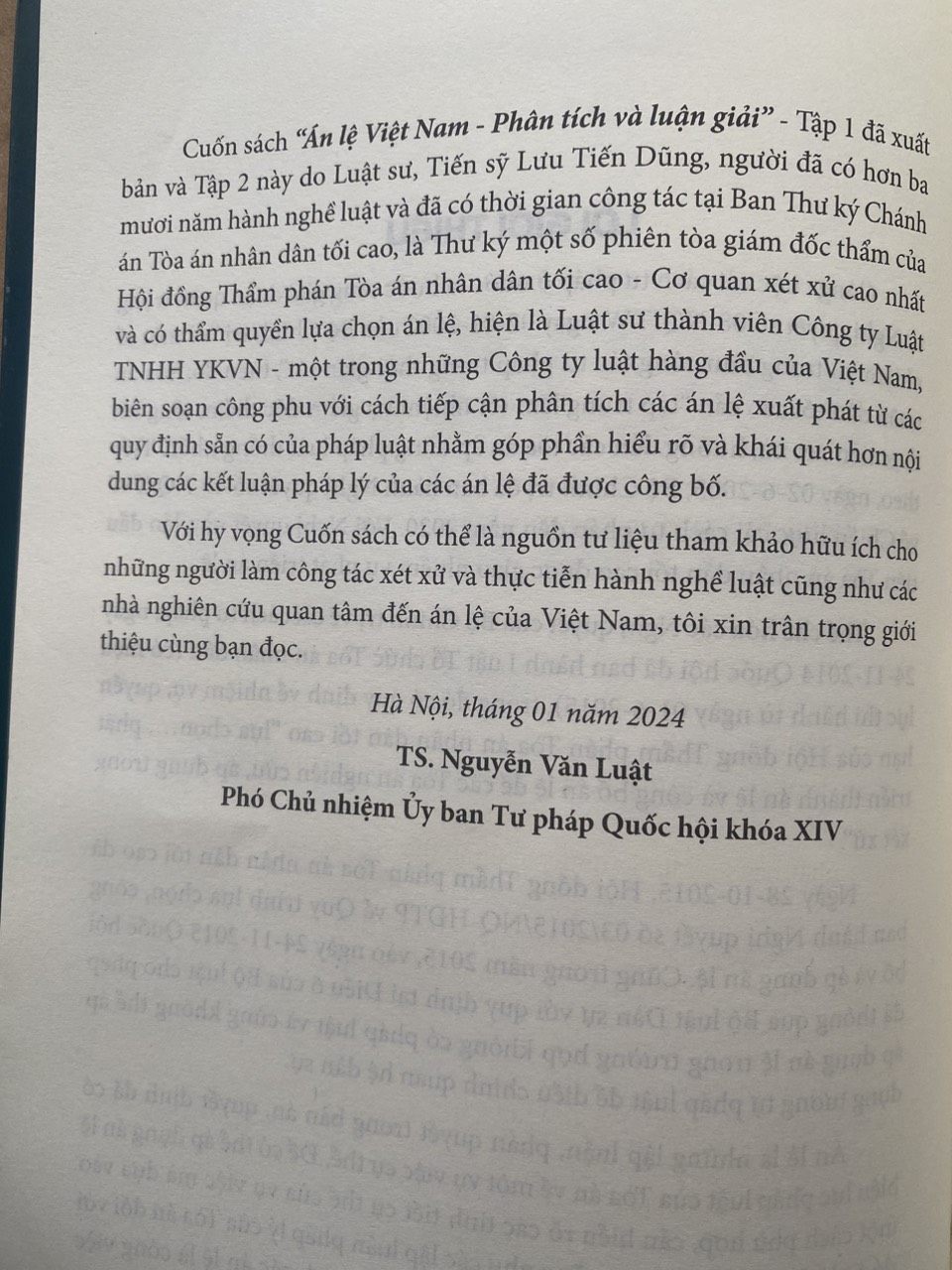 Cuốn sách "Án lệ Việt Nam - Phân tích và luận giải" - Tập 1 đã xuất bản và Tập 2 này do Luật sư, Tiến sỹ Lưu Tiến Dũng, người đã có hơn ba mươi năm hành nghề luật và đã có thời gian công tác tại Ban Thư ký Chánh án Tỏa án nhân dân tối cao, là Thư ký một số phiên tòa giám đốc thẩm của Hội đồng Thẩm phán Tòa án nhân dân tối cao - Cơ quan xét xử cao nhất và có thẩm quyền lựa chọn án lệ, hiện là Luật sư thành viên Công ty Luật TNHH YKVN - một trong những Công ty luật hàng đầu của Việt Nam, biên soạn công phu với cách tiếp cận phân tích các án lệ xuất phát từ các quy định sẵn có của pháp luật nhằm góp phần hiểu rõ và khái quát hơn nội dung các kết luận pháp lý của các án lệ đã được công bố.