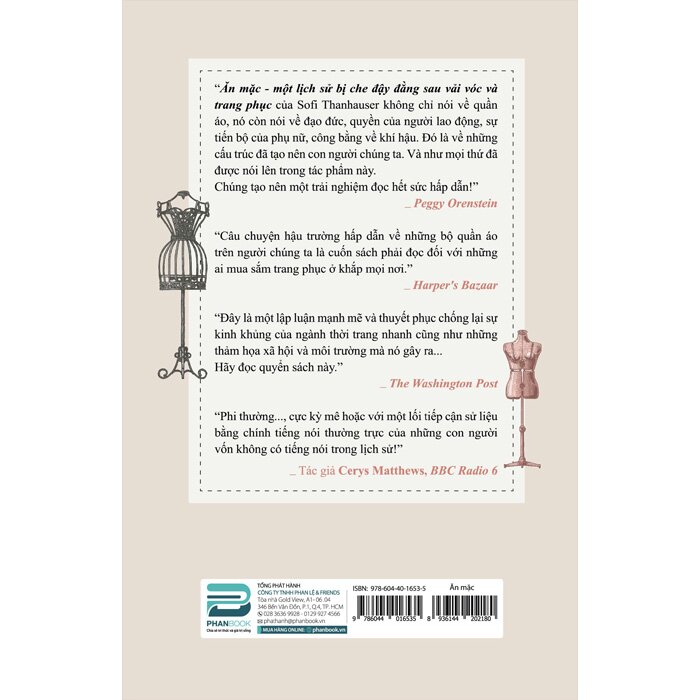 “Ăn mặc - một lịch sử bị che đậy đằng sau vải vóc và trang phục của Sofi Thanhauser không chỉ nói về quần áo, nó còn nói về đạo đức, quyền của người lao động, sự tiến bộ của phụ nữ, công bằng về khí hậu. Đó là về những cấu trúc đã tạo nên con người chúng ta. Và như mọi thứ đã được nói lên trong tác phẩm này. Chúng tạo nên một trải nghiệm đọc hết sức hấp dẫn!” - Peggy Orenstein