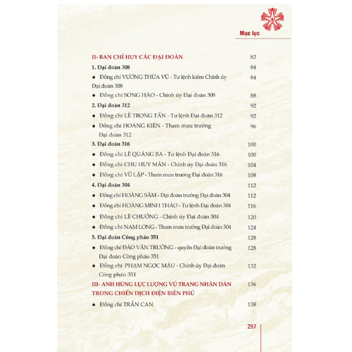 Trên cơ sở tiếp cận tư liệu từ nhiều nguồn khác nhau, đặc biệt là nguồn tư liệu do Hội Cựu chiến binh các tỉnh, thành phố trên cả nước cung cấp, bản sách in phác họa chân dung những người chỉ huy, anh hùng, chiến sĩ Điện Biên Phủ, từ vị Chỉ huy tối cao của Chiến dịch, của cuộc kháng chiến chống thực dân Pháp là Chủ tịch Hồ Chí Minh, từ Bộ Chỉ huy Chiến dịch đến Ban Chỉ huy của các đại đoàn cùng hơn 30 Anh hùng Lực lượng vũ trang nhân dân góp phần quan trọng làm nên chiến thắng lịch sử Điện Biên Phủ. Song song với đó là bản sách điện tử gồm danh sách các anh hùng, liệt sĩ, bộ đội, thanh niên xung phong, dân công hỏa tuyế của 53 tỉnh, thành phố trên cả nước đã tham gia chiến dịch.