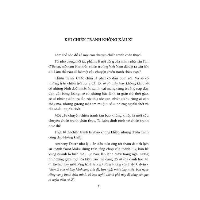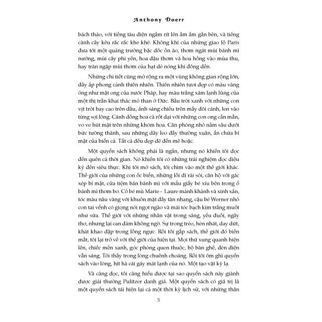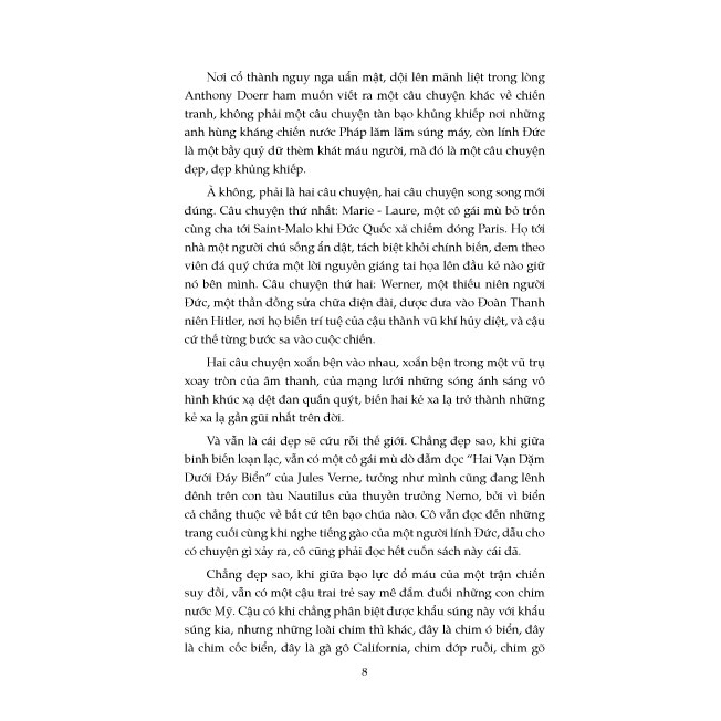 “Marie Laure sống cùng cha tại Paris, gần bảo tàng Lịch sử tự nhiên, nơi cha cô làm thợ khóa chính. Khi lên 6 tuổi, Marie Laure bị mù. Cha cô đã dựng một mô hình thu nhỏ hoàn chỉnh về khu phố hai cha con đang sống để cô có thể ghi nhớ bằng cách chạm và lần tìm đường về nhà. Năm Marie Laure 12 tuổi, Đức Quốc xã chiếm giữ Paris, cô cùng cha chạy trốn đến thành phố nằm trong tường thành, Saint-Malo, nơi ông chú thích ẩn dật của cha cô sống trong một ngôi nhà cao ven biển. Hai cha con họ đã mang theo một viên đá quý giá trị nhất và cũng nguy hiểm nhất viện bảo tàng.