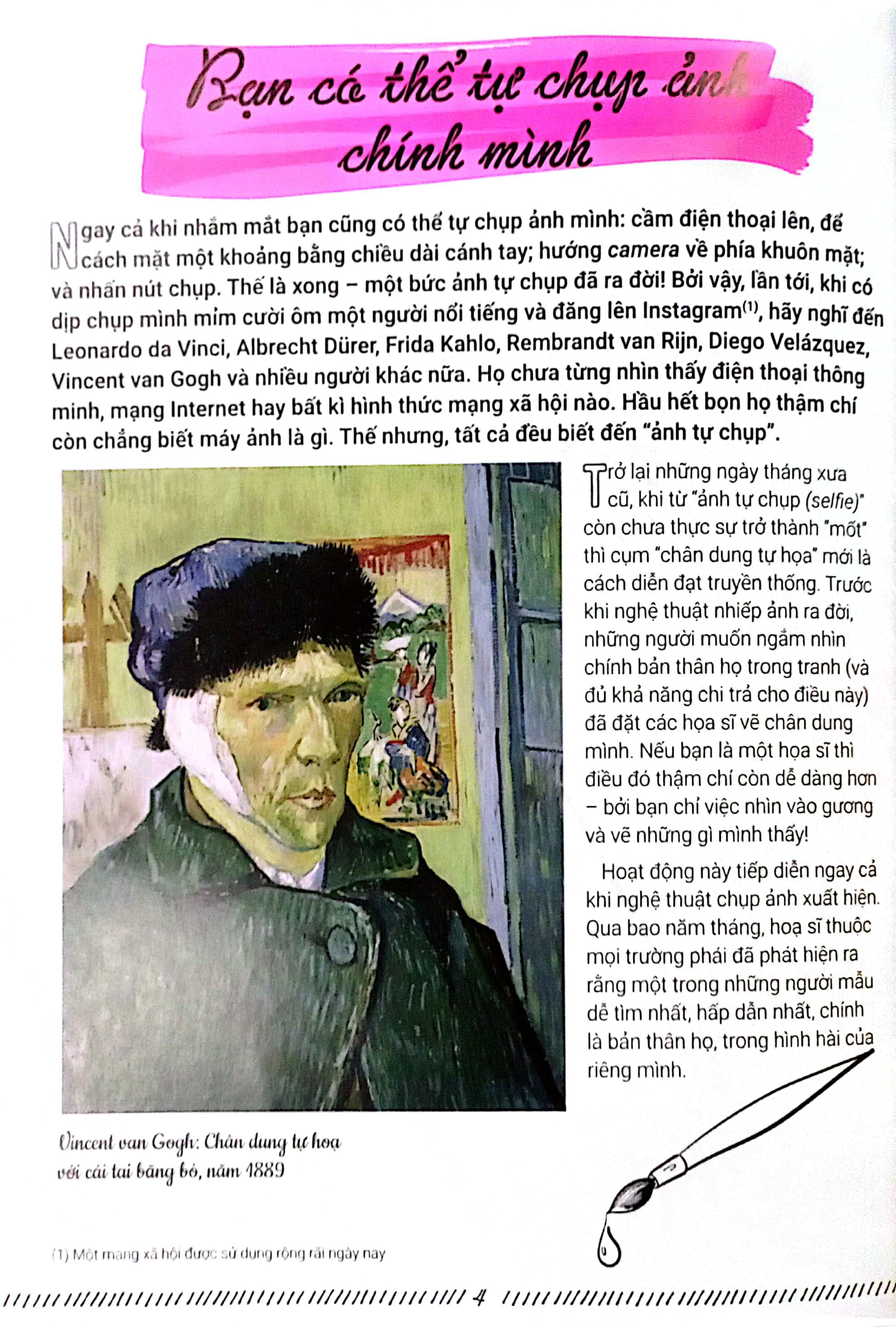 Đáp: Không phải những người mang họ Kardashian đâu! Giờ đây ảnh tự chụp đã trở thành một phần trong cuộc sống thường nhật của chúng ta. Vậy nghệ thuật này đến từ đâu? Ai đã phát minh ra chúng? Và tại sao? Hãy lật giở từng trang sách và tìm câu trả lời! Đồng thời, bạn sẽ khám phá ra vài thủ thuật và câu chuyện phía sau những bức chân dung tự hoạ nổi tiếng đấy!
