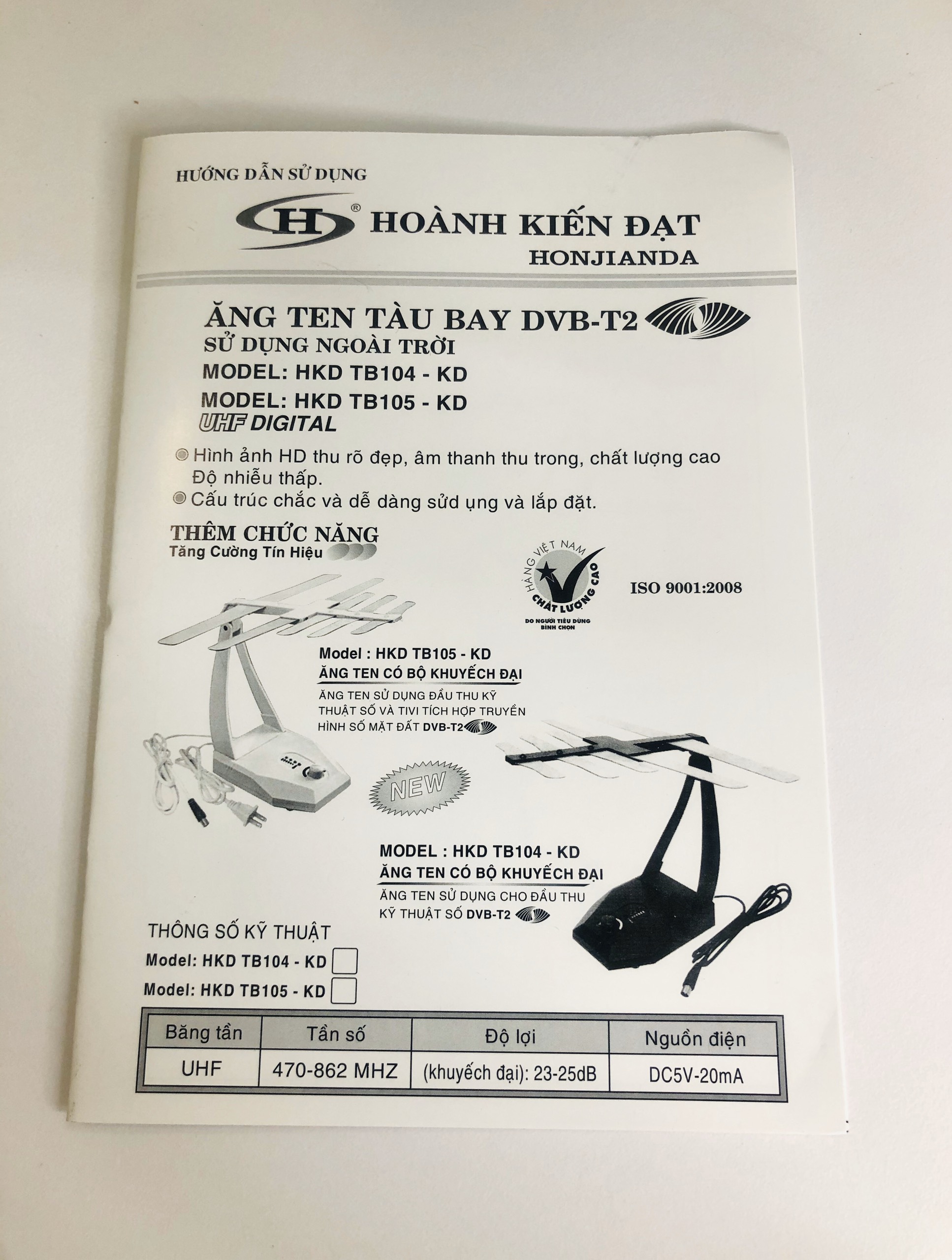 Mua tại TiktokAnten Tàu Bay Truyền Hình Số Mặt Đất DVB-T2 - HKD TB105-T2 Anten sử dụng đầu thu KTS và tivi tích hợp truyền hình số mặt đất DVB-T2 Thông số kỹ thuật