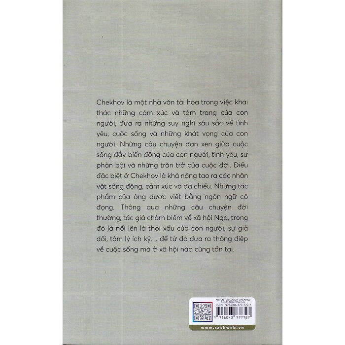 Thông tin tác giả Anton Pavlovich Chekhov: Sinh (1860-1904) là nhà soạn kịch, nhà văn viết truyện ngắn nổi tiếng người Nga. Tác giả của hàng trăm truyện ngắn với các tác phẩm tiêu biểu: Phòng 6, Nhà tu hành vận đồ đen, Người đàn bà có con chó nhỏ, Khóm phúc bồn tử,