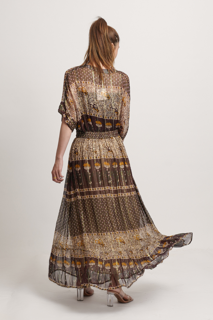 Áo cotton cao cấp, nền vải ánh kim nhẹ, màu ombre độc đáo. Phom suông, có thể mặc thành đầm dấu quần phối với quần short, hoặc mặc với quần jeans, quần legging. Dài 78cm.