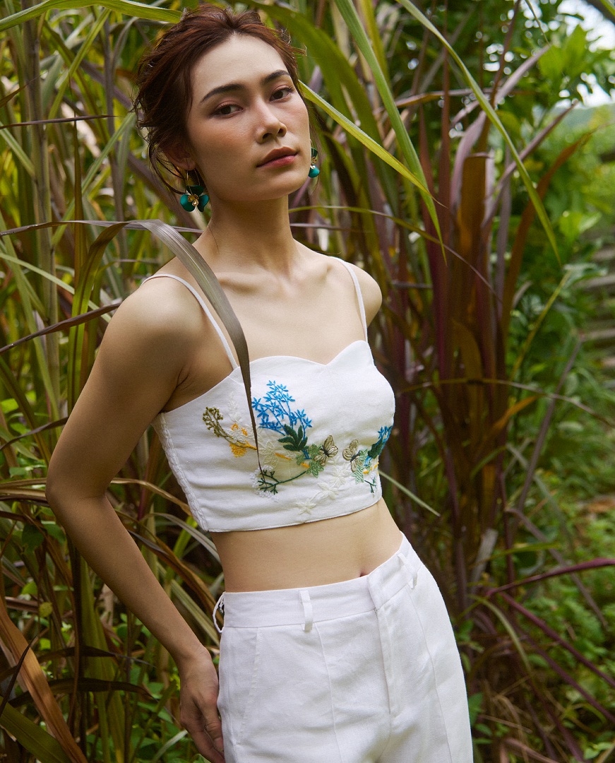 Thêu tay hoạ tiết Mơ độc bảnKiểu dáng croptop hở bụng Dây vai có khoen điều chỉnh độ dài dâyỨng dụng kỹ thuật thun chỉ smock sau lưng giúp ôm trọn vòng ngực, tạo dáng ngực đẹp và thoải mái vận độn...