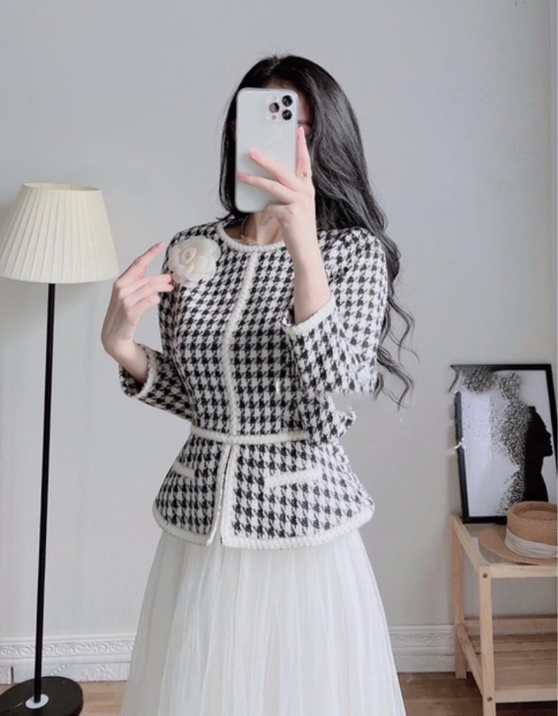 Hàng của Shop là hàng cao cấp, chất liệu dạ tweed dày dặn, 2 lớp, có lớp lót bên trong mặc không hề dặm ngứa, khó chịu. Vải được dệt xen kẽ giữa các sợi đen và trắng là các sợi kim tuyến cao cấp, khi mặc bắt sáng sẽ vô cùng sang, khác hẳn hàng loại rẻ tiền loại 2, loại 3, chỉ dệt có sợi đen và trắng thôi Khách nha.