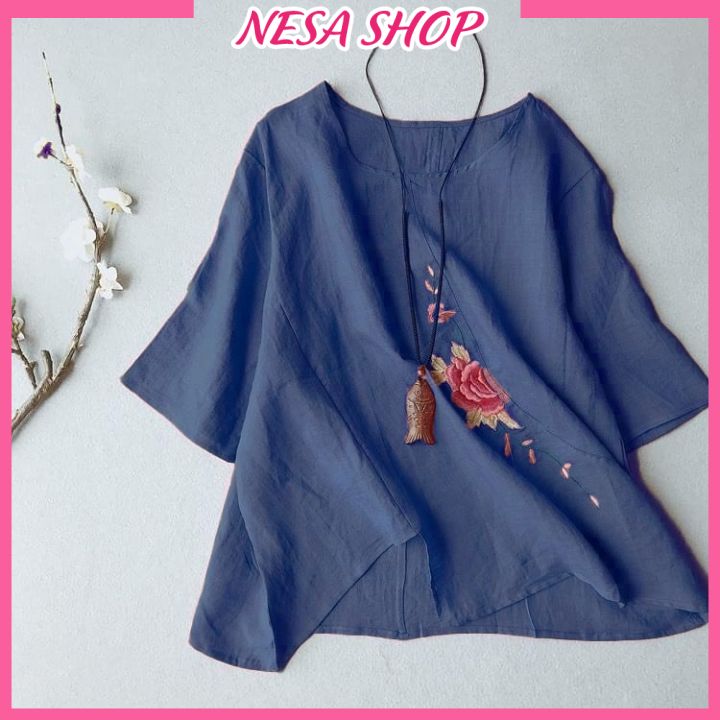 ✨Áo kiểu nữ cổ tròn tay lỡ form rộng thoải mái, chất liệu Đũi cao cấp mềm mịn, mát, hoạ tiết Thêu tỉ mỉ NeSa Shop AKH.57