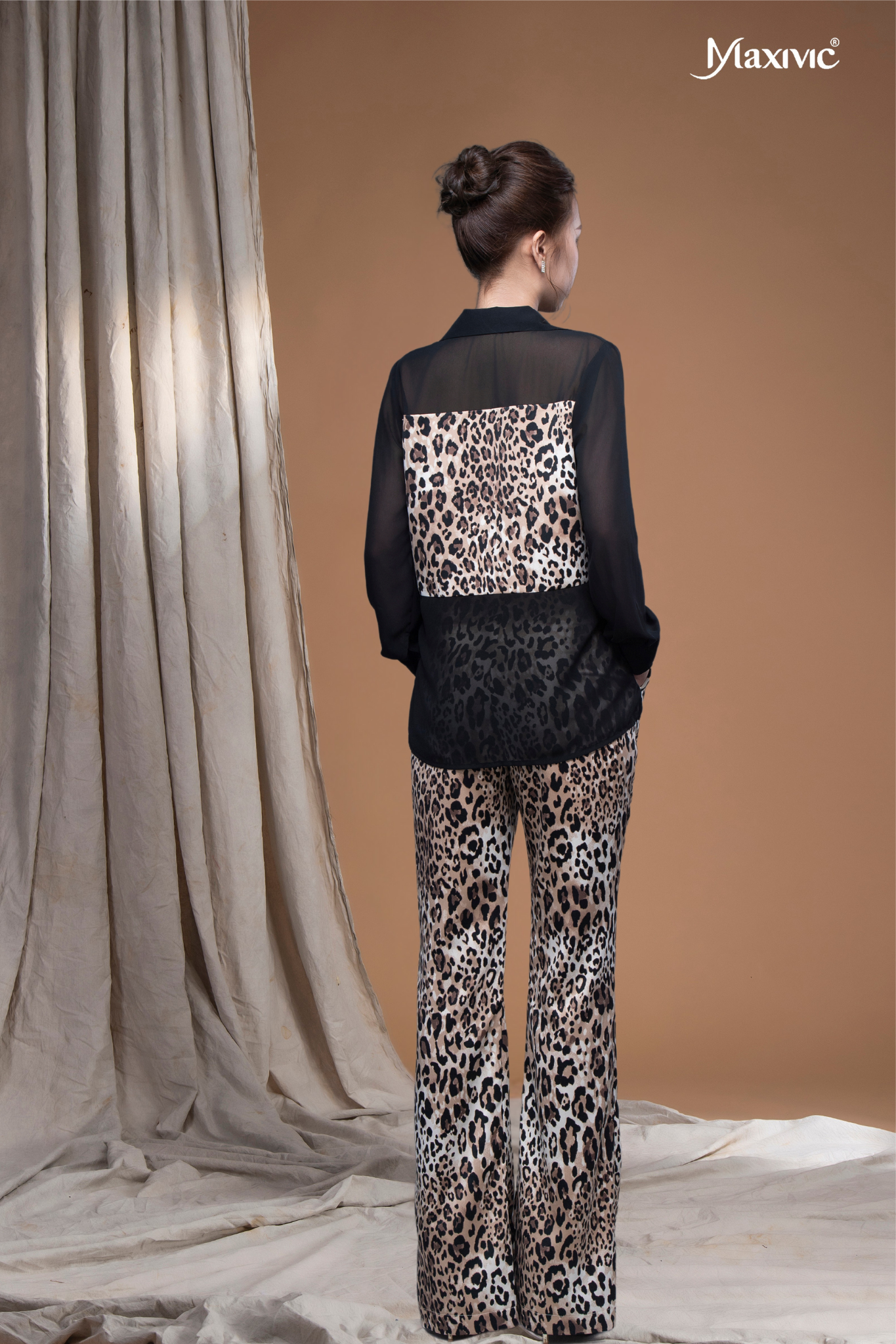 Thiết kế áo sơmi lụa voan đen xuyên thấu phối cùng hoạ tiết da beo tạo điểm nhấn, mang lại diện mạo quyến rũ và cá tính.