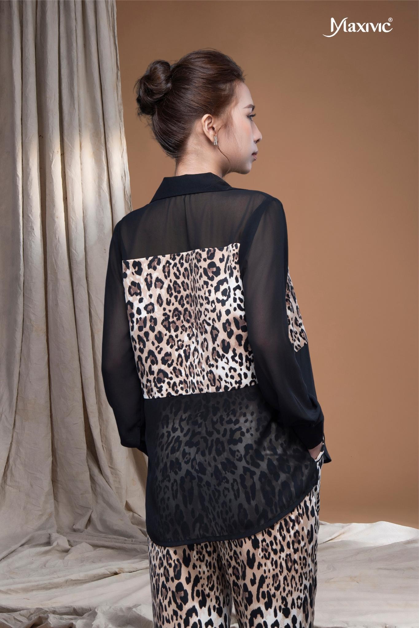 - Chất liệu: Vải chiffon phối lụa cát HQ - Thiết kế áo sơmi lụa voan đen xuyên thấu phối cùng hoạ tiết da beo tạo điểm nhấn, mang lại diện mạo quyến rũ và