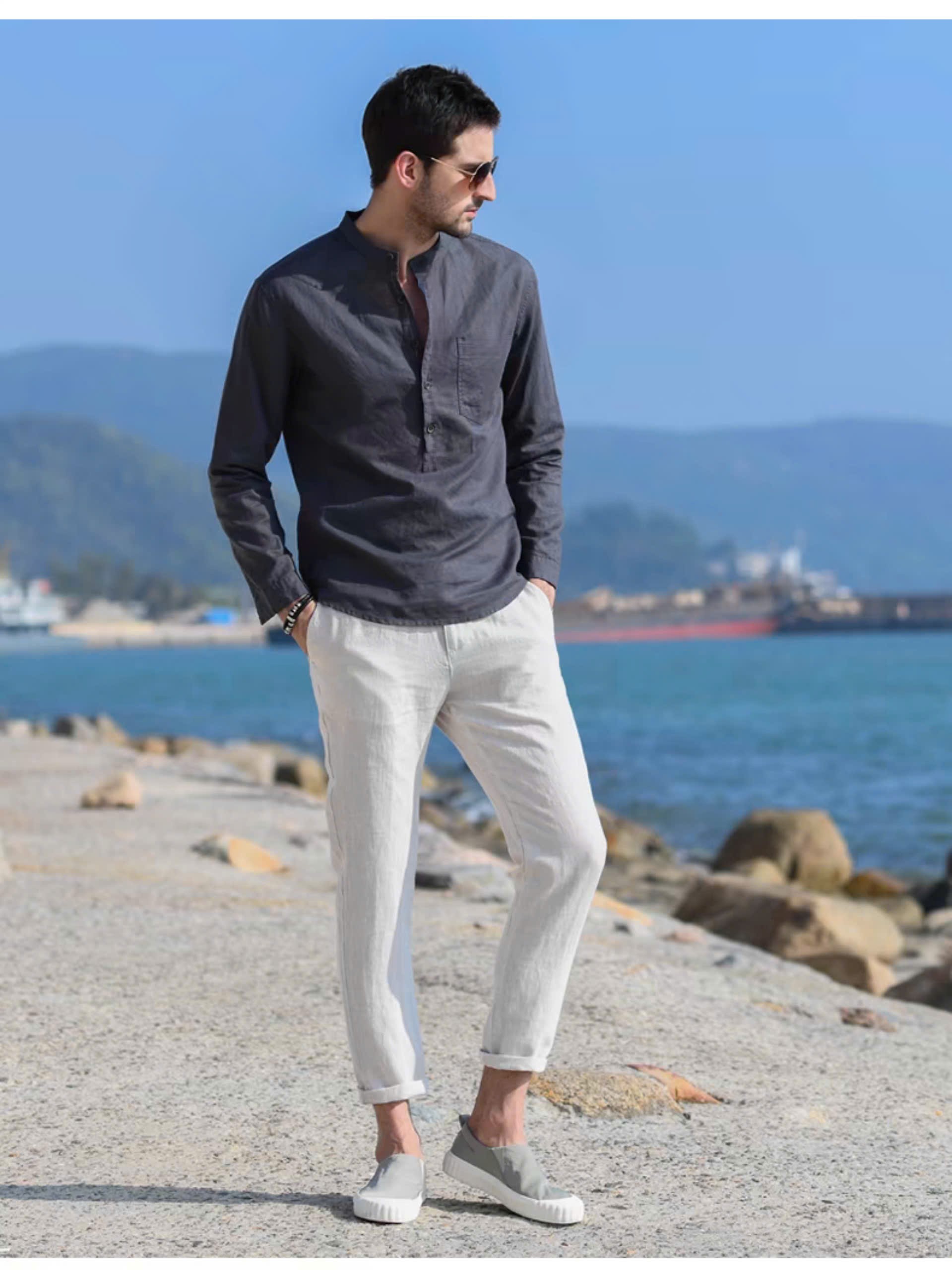 Áo sơ mi nam form rộng cổ tàu cổ trụ tay dài Giấu Nút phong cách hàn quốc trẻ trung lịch lãm-MRDT02 - ÁO SƠ MI NAM RỘNG TAY DÀI mặc rộng thoải mát, mát