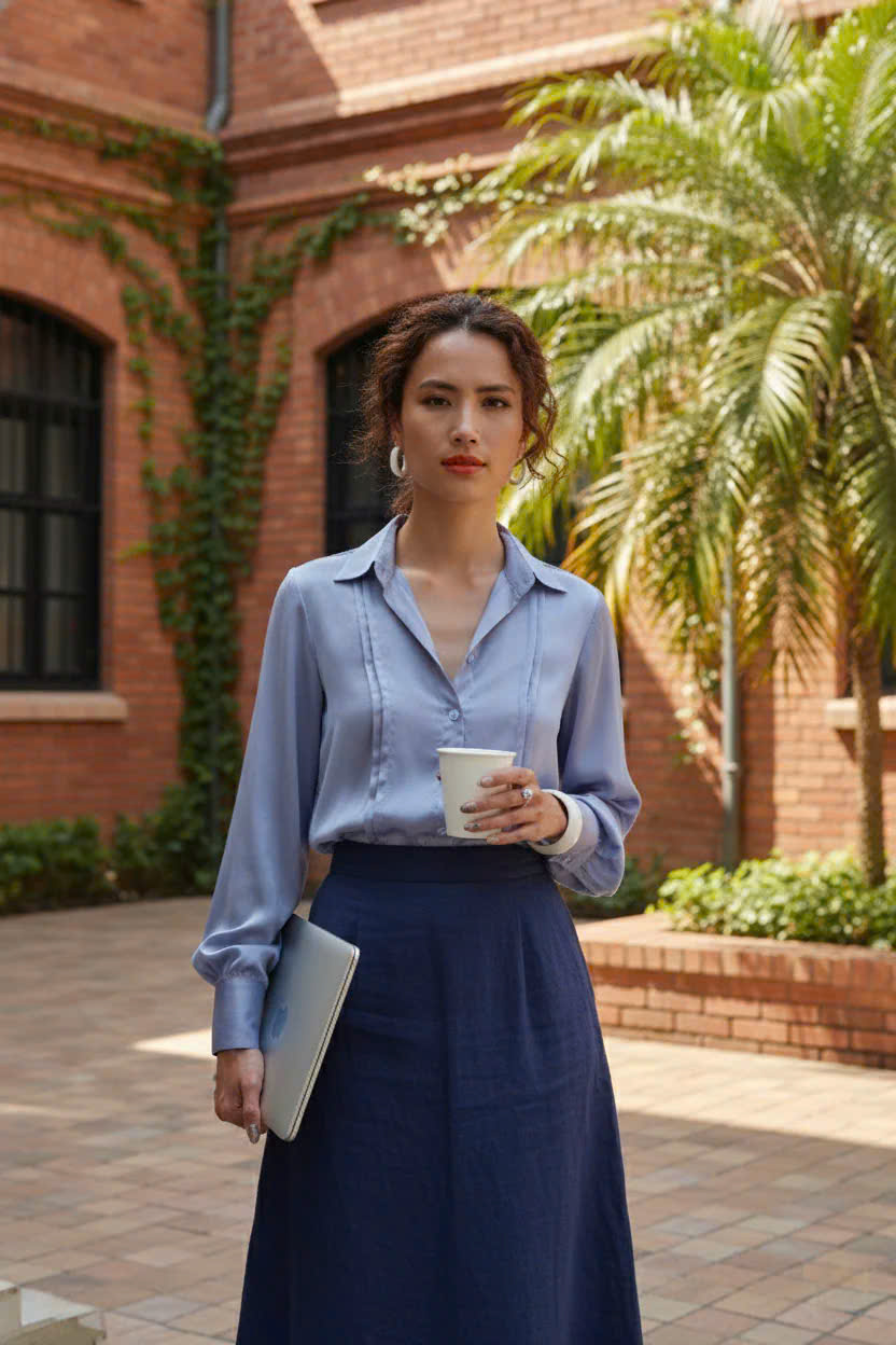 - Chất liệu mềm mại: Chất liệu là điểm nhấn quan trọng nhất. Lụa tổng hợp tạo độ rủ tự nhiên, mềm mại trên da, mang lại cảm giác mát lạnh trong ngày hè và giữ được sự sang trọng, đứng dáng cần thiết cho môi trường làm việc. Ánh sáng vàng của buổi chiều tà càng làm nổi bật độ bóng nhẹ (sheen) của lụa, khiến bạn tỏa sáng một cách tự nhiên.