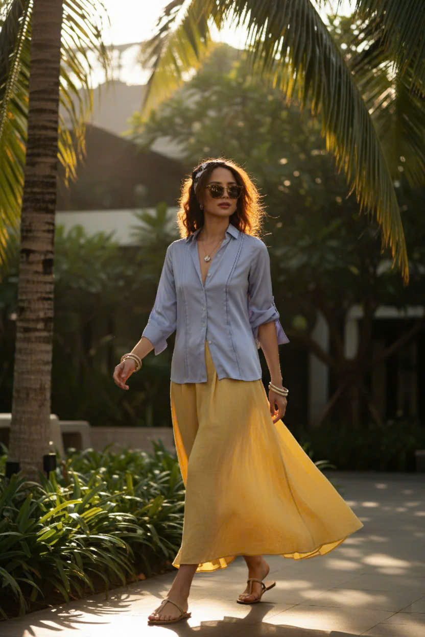 Nghệ nhân cắt may: Local Made Trong nhịp sống hiện đại, vẻ đẹp đích thực không nằm ở sự cầu kỳ, mà ở sự tự tại và thanh lịch không cố gắng (effortless elegance). Chiếc Áo sơ mi sinh ra để tôn vinh tinh thần ấy. Hãy tưởng tượng bạn đang sải bước trên hiên resort, dưới tán lá cọ xanh mướt, ánh hoàng hôn vàng óng ươm lên làn da và chất vải nhẹ nhàng màu xanh da trời thanh cao. Chiếc áo Thanh Lâm nhẹ nhàng bay lượn theo từng cơn gió nhiệt đới, mang đến cảm giác thư thái tuyệt đối. Chiếc áo sơ mi này là sự kết hợp hoàn hảo giữa phom dáng công sở truyền thống và chất liệu lụa cao cấp: