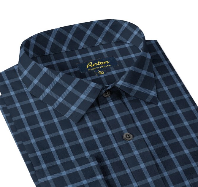 Áo Sơ Mi Nam Công Sở Trung Niên Thương Hiệu Anton Dài Tay Vải Sợi Tre Xanh Dương Kẻ Caro Chìm AT203