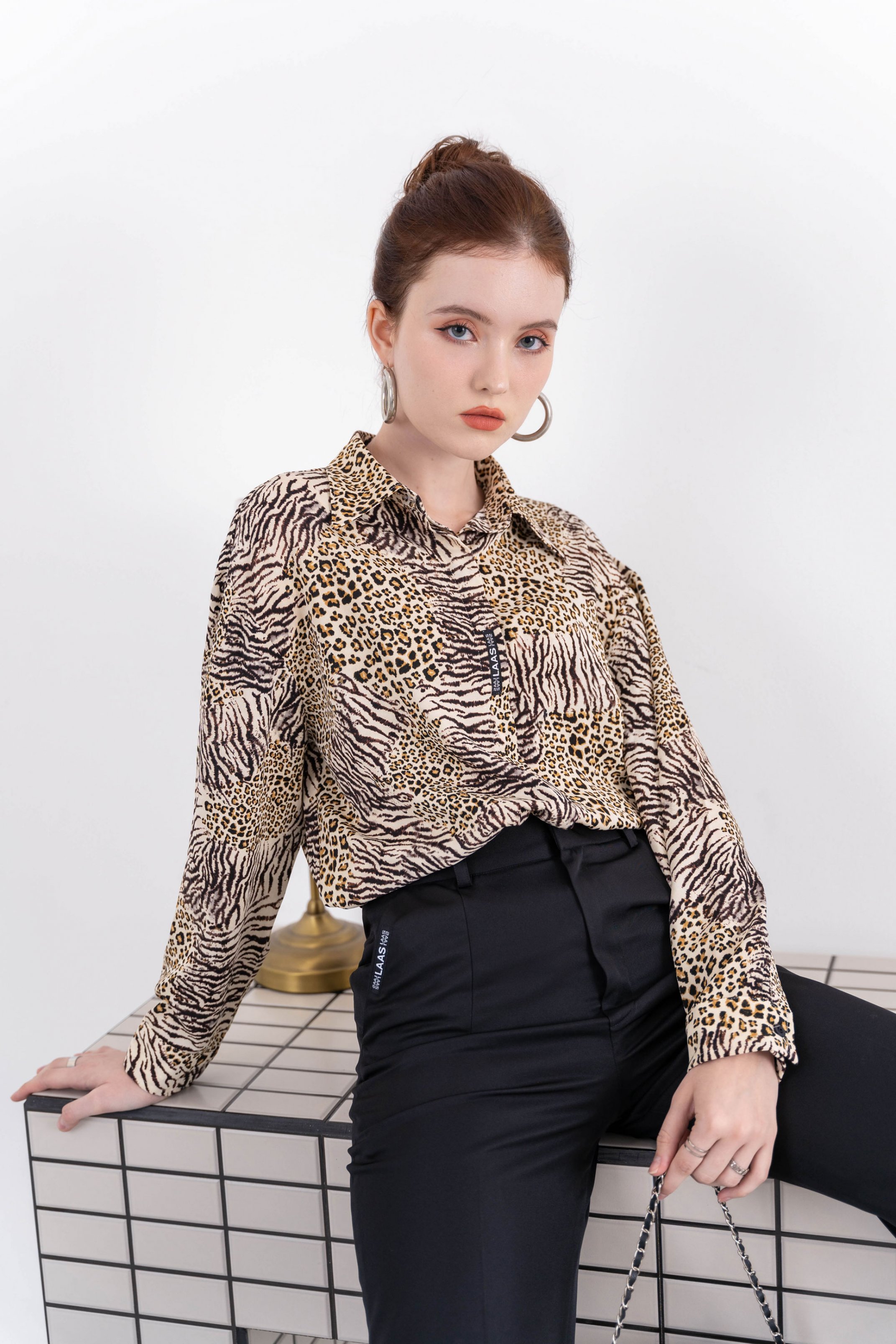 Áo sơ mi La Mộc họa tiết da beo thể hiện được nữ quyền. Thiết kế tay lỡ phồng và nhún nhẹ mang đến cảm giác thanh lịch cho nàng. Thiết kế với sự chỉnh