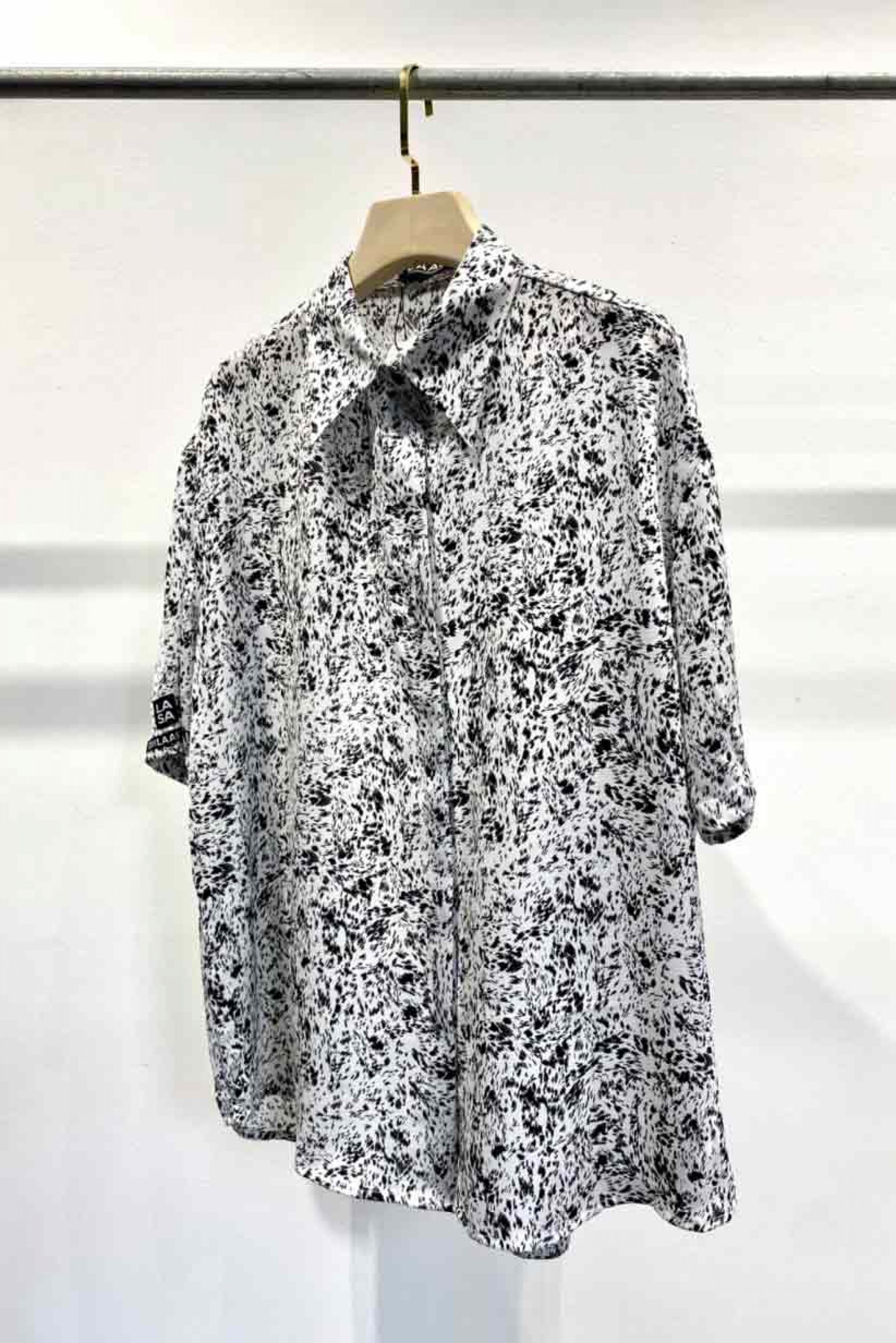 CHẤT LIỆU MANGO, MỀM MƯỢT, KHÔNG NHĂN ÁO MÀU TRẮNG, HOẠ TIẾT MÀU ĐEN ÁO SOMI NẸP GIẤU NÚT FORM RỘNG FREESIZE ĐIỂM NHẤN 1 BÊN TAY PHẢI ÁO GẮN TAG LOGO LAAS