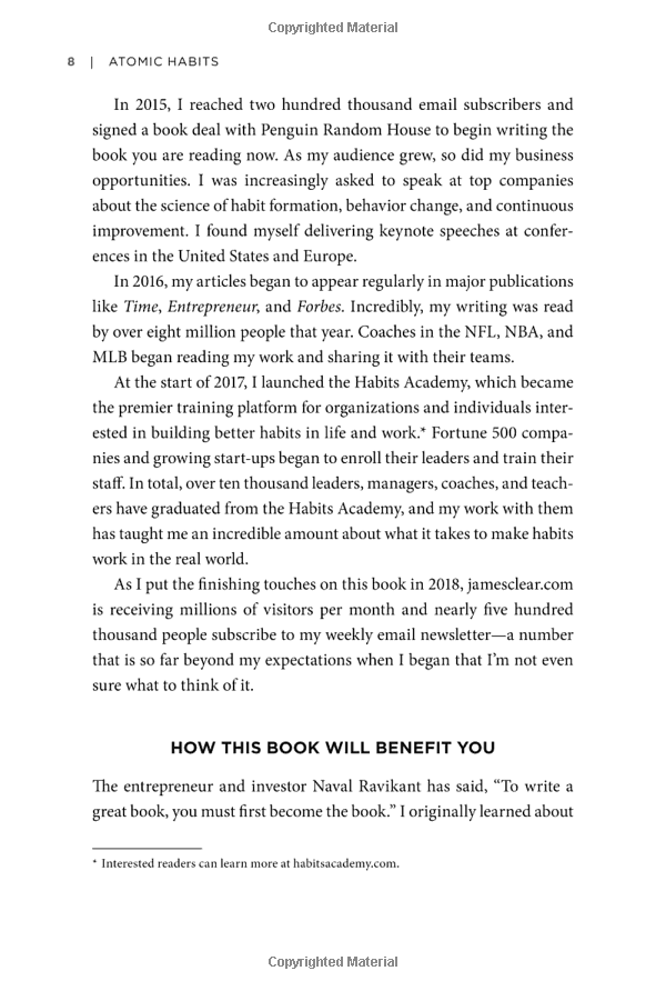 In this ground-breaking book, Clears reveals exactly how these minuscule changes can grow into such life-altering outcomes. He uncovers a handful of simple life hacks (the forgotten art of Habit Stacking, the unexpected power of the Two Minute Rule, or the trick to entering the Goldilocks Zone), and delves into cutting-edge psychology and neuroscience to explain why they matter. Along the way, he tells inspiring stories of Olympic gold medalists, leading CEOs, and distinguished scientists who have used the science of tiny habits to stay productive, motivated, and happy.