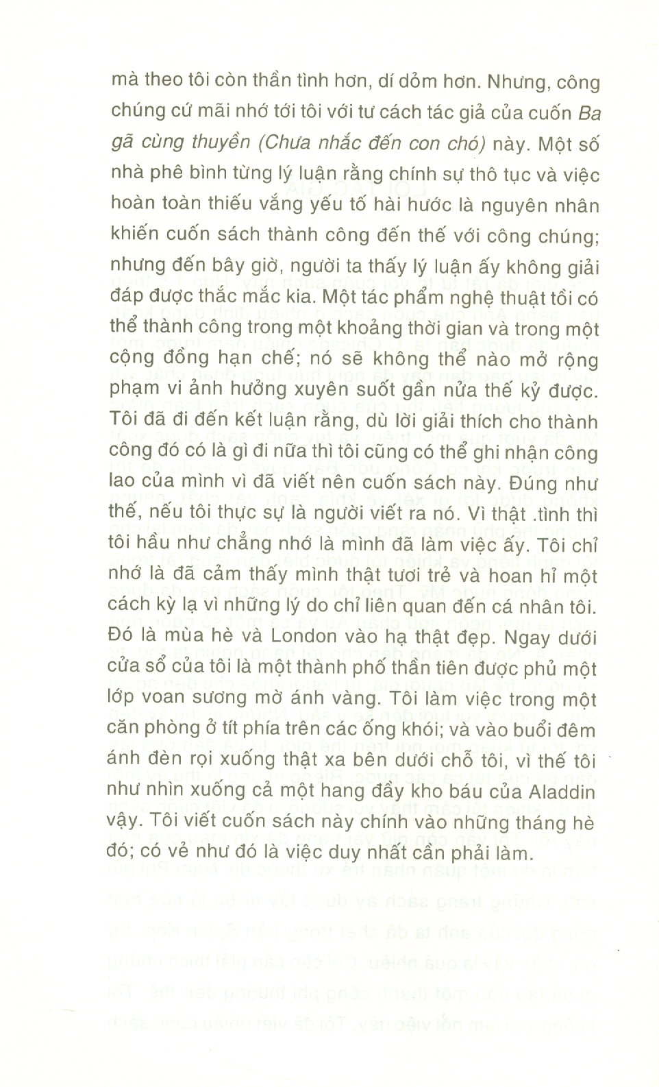Nhờ đó, độc giả có thể ngấu nghiến từng câu từng chữ những câu chuyện ly kỳ hấp dẫn mà gã J. ấy đã vui lòng kể lại, có thể xuýt xoa trước tầng tầng lớp lớp kiến thức văn hóa, lịch sử, địa lý trong tác phẩm, có thể tấm tắc trước văn phong, có thể cười lăn trước những chi tiết khôn lường, có thể vỗ đùi đánh đét mà ngưỡng mộ văn tài của tác giả. Và, xin nhắc độc giả rằng, đây không phải một câu chuyện, đây là bản tường thuật chân thực không thể bỏ lỡ về một chuyến du hành sông nước “độc nhất vô nhị”…