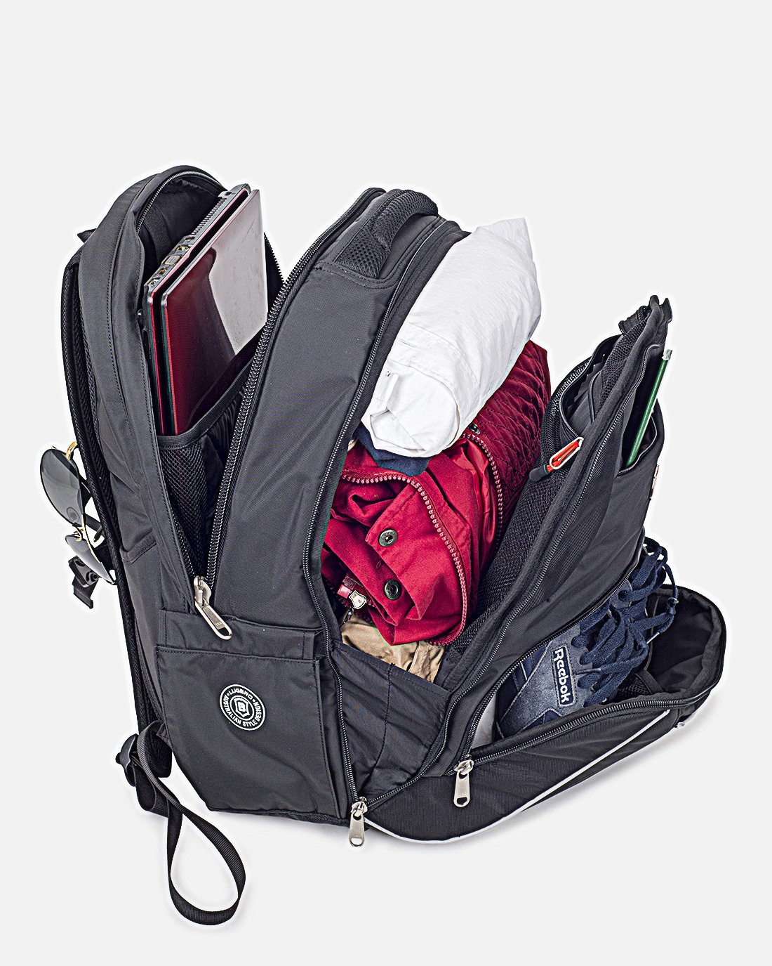 Ba ngăn chính rộng rãi thiết kế đặc biệt thông minh dành cho những ngưởi thường xuyên đi công tác, mà phải mang theo cả bộ , cần (, , pin sạc và các công cụ khác) hoăc có thể sử dụng chơi thề thao, có ngăn chứa giầy rộng rãi, cực kì đa năng và  lý tưởng dành cho người bận rộn.(Ba ngăn chính rộng rãi các ngăn phụ thiết kế đa chức năng có thể chứa quần áo từ 05 đến 08 bộ đồ, giày dé, chứa Laptop 14 inch –17 inch,Tablet 10 –12 inch riêng biệt chống trầy xước và rung lắc , ngăn điện thoại di động,  thẻ nhớ, ổ cứng, tai nghe, hồ sơ,giấy tờ, mắt kính, khe đựng viết, ngăn chứa Namecard, Passport …)