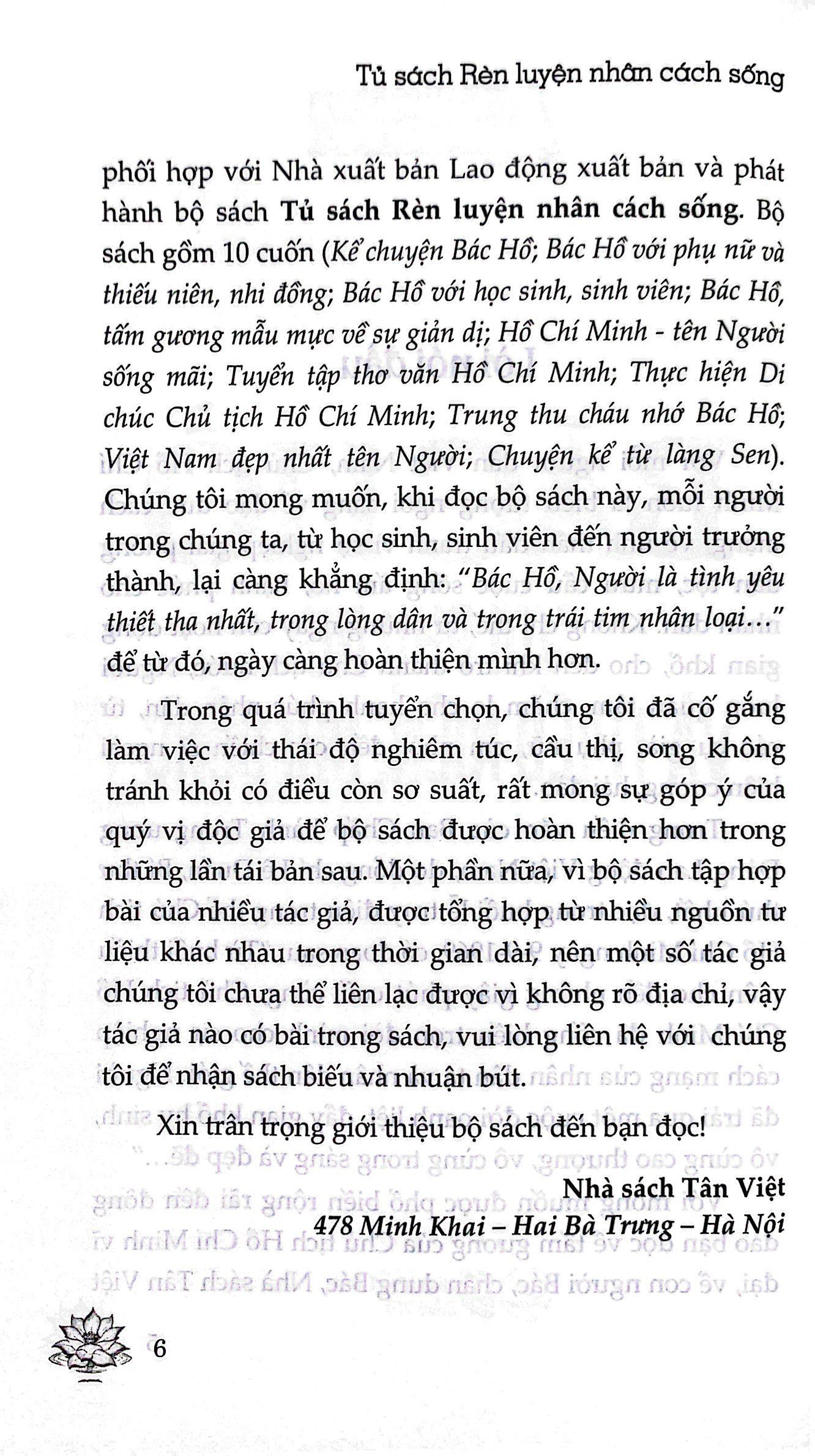 Mua tại TiktokNằm trong "Tủ Sách Bác Hồ", Cuốn sách “Bác Hồ Với Phụ Nữ Và Thiếu Niên Nhi Đồng”, là một tác phẩm viết về những Câu chuyện của Bác cùng với Phụ Nữ và các em thiếu niên Nhi Đồng. Cuốn sách do Nhà sách Tân Việt và NXB Văn Học liên kết hợp tác phát hành. Sách được xuất bản lần đầu năm 2017 và đã được công chúng nồng nhiệt đón nhận. Cuốn sách đã trở nên thân thiết với các bạn đọc với nhiều lứa tuổi khác nhau, đặc biệt là các cháu thiếu niên.