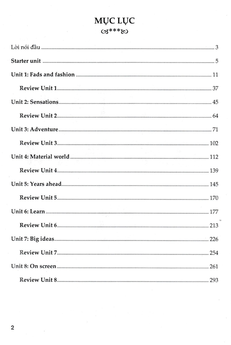 Bài tập Tiếng Anh 8 – Không đáp án gồm một bài ôn tập củng cố kiến thức đã học (Starter Unit), và 8 đơn vị bài học chính: Fads and fashions, Sensations, Adventure, Material world, Years ahead, Learn, Big ideas, On screen và sau mỗi đơn vị bài học đều có bài ôn tập Review.